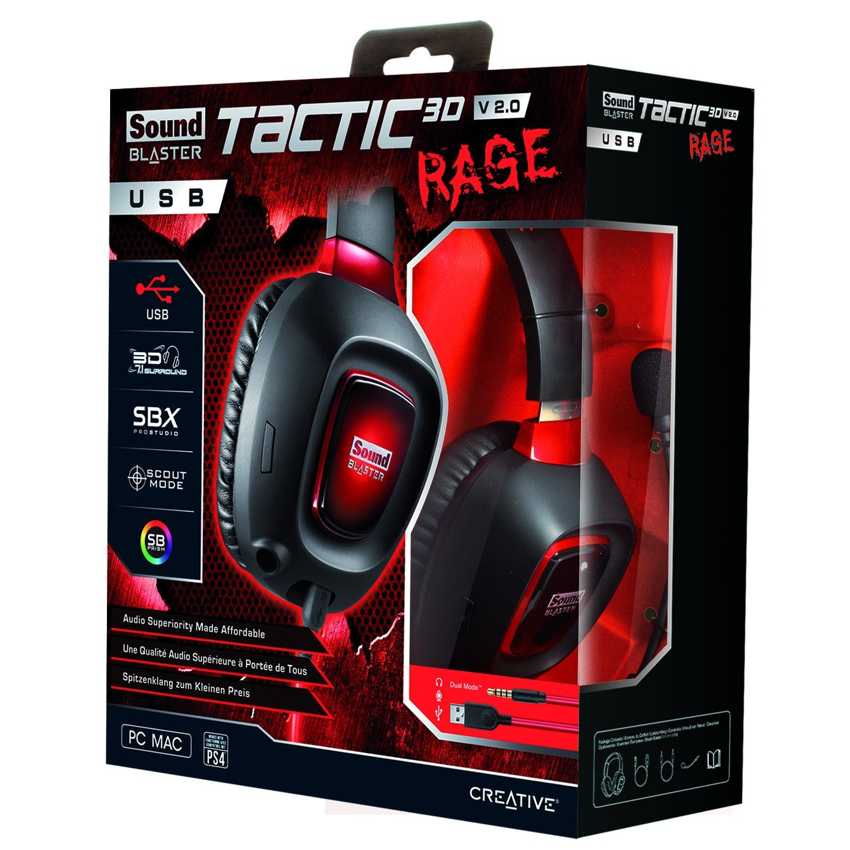 Descripción Creative Labs Sound Blaster Tactic3D Rage USB V2.0. Utilizar con: PC/Juegos. Tipo de auricular: Binaurale, Estilo de uso: Diadema, Color del producto: Negro. Interfaz del dispositivo: 3.5 mm (1/8") + USB, Conectividad del dispositivo: Alámbrico. Frecuencia de auricular: 20 - 20000 Hz, Unidad de disco: 5 cm. Sistema operativo MAC soportado: Mac OS X 10.8 Mountain Lion, Mac OS X 10.9 Mavericks, RAM mínima: 512 MB, Procesador mínimo: Intel Pentium 4 1.6GHz/AMD