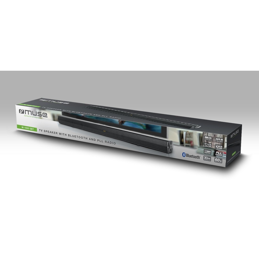 Descripción Te presentamos la barra de sonido de Muse, la M-1600 SBT con radio fm con 30 presintonias, 60W, bluetooth, entrada auxiliar, USB y mando a distancia.