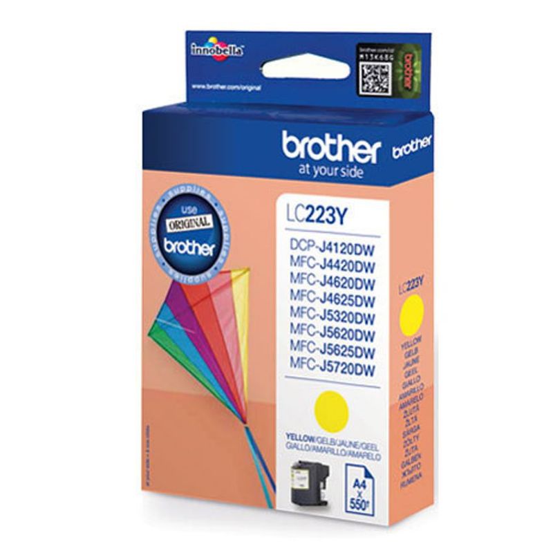 Descripción Brother LC-223YBP. Tipo: Original, Tipo de tinta: Tinta a base de pigmentos, Colores de impresión: Amarillo. Tipo de embalaje: Ampolla. Pie de página con producción de páginas: ISO / IEC 24711, Dimensiones de papel: A4
