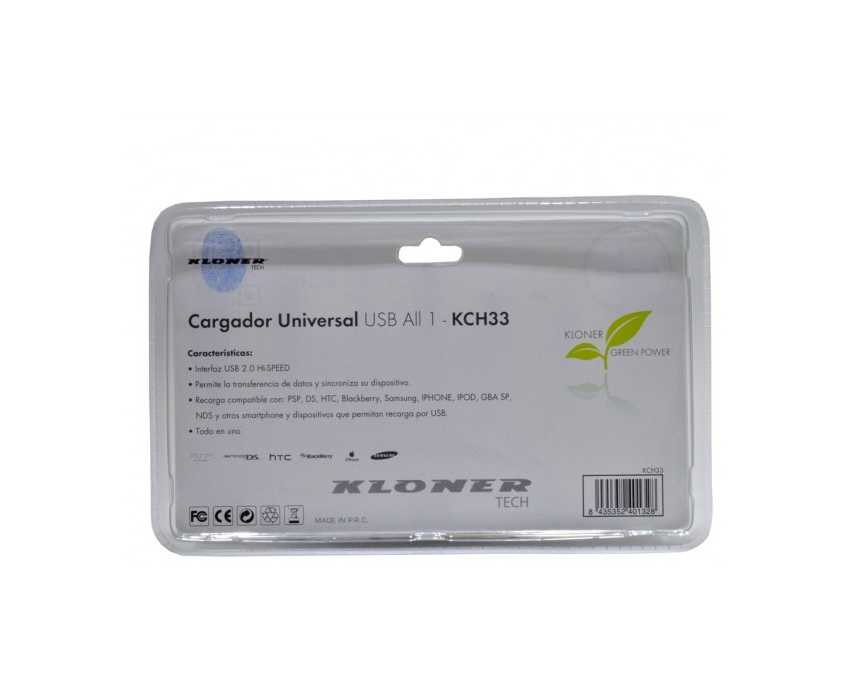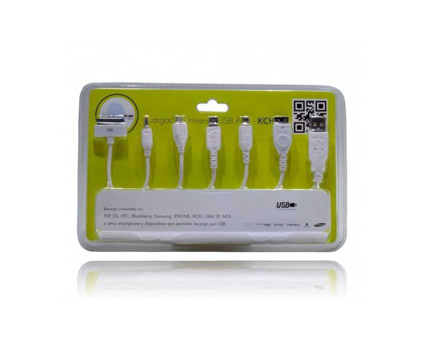 Cargador Universal USB ALL 1 con Interfaz USB 2.0 Hi-Speed que permite la Transferencia de datos y sincroniza su dispositivo, Recarga compatible con PSP, DS, HTC, BlackBerry, Samsung IPhone, IPod, IPad, GBA SP, NDS y otros Smartphone y dispositivos que permitan recargas por USB, Todo en Uno. KCH33 Cargador Universal USB ALL 1 • Interfaz USB 2.0 Hi-Speed |