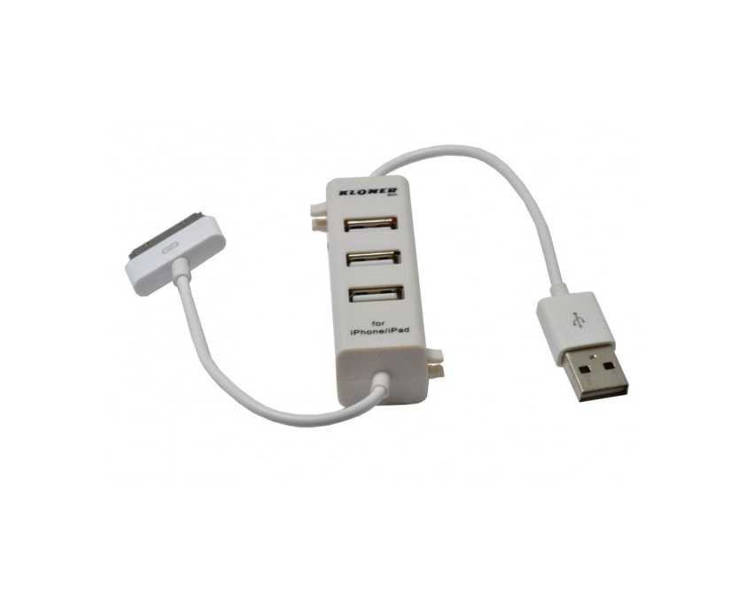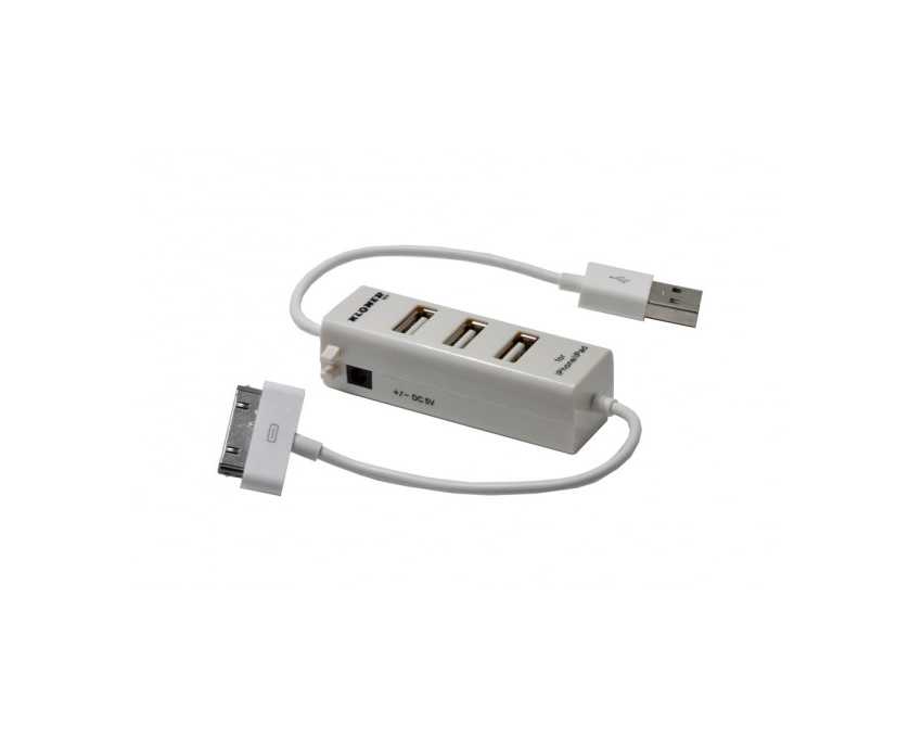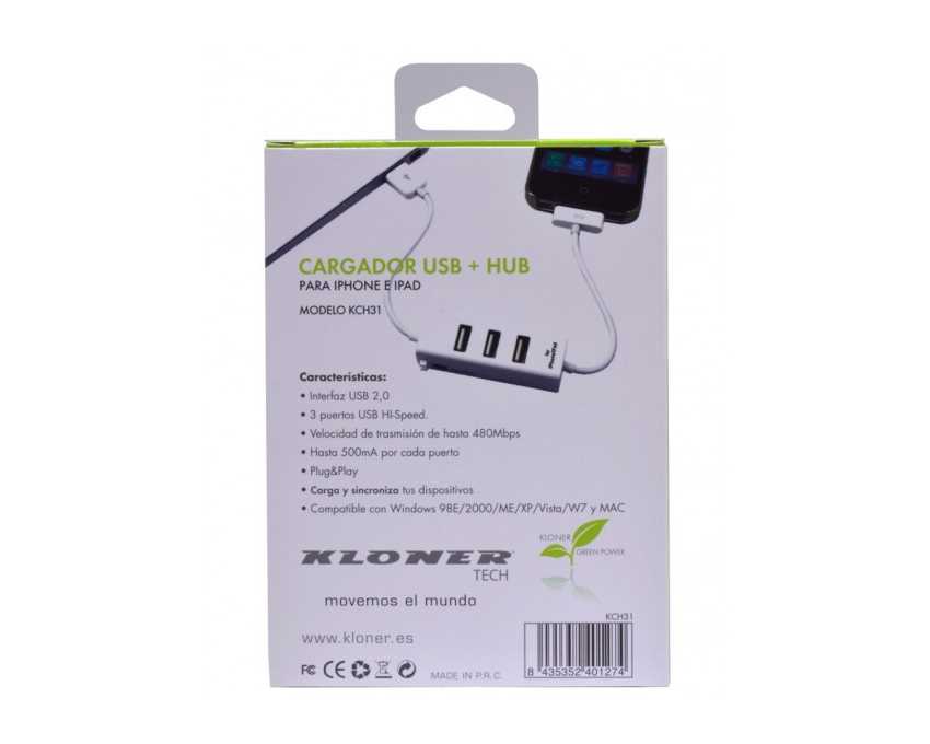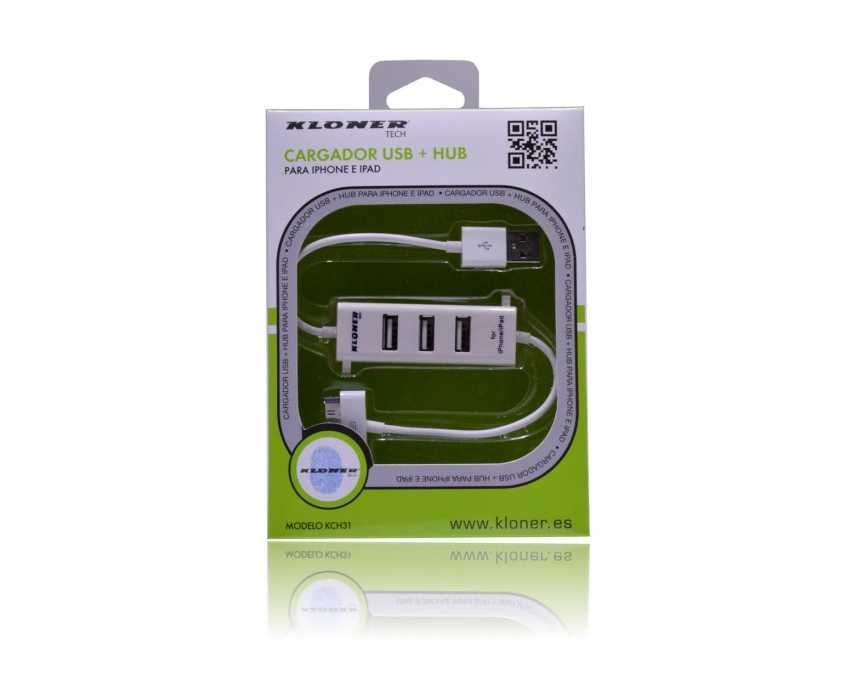 Cargador USB + HUB para Iphone,Ipad,Ipad con Interfaz USB 2.0 ademas de 3 puertos USB HI-Speed con Velocidad de trasmisión de hasta 480Mbps, Hasta 500mA por cada Puerto, Plug&Play ,Carga y sincroniza tus dispositivos, Compatibles con Windows 98E/2000/ME/XP/Vista/W7 y MAC.