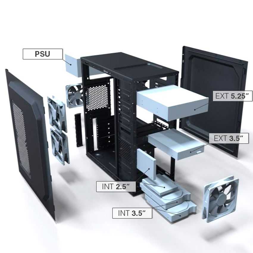 - Eficiente sistema de gestión de cableado - Acabado brush del panel frontal - Avanzado sistema de refrigeración - Compatible con gráficas de hasta 330 mm - Fácil instalación de nuevos disipadores de CPU - Diseño interior con bordes pulidos - Espacio para 5 discos duros - Hasta 4 ventiladores
