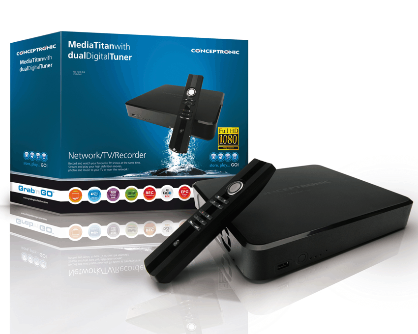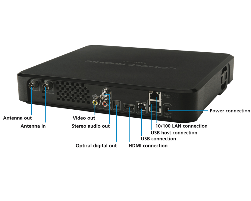 Chipset ST Micro 7109 Amount of RAM 256 MB Ethernet 10 / 100 Mbit/s Wireless (only on CMT2DW) 802.11b/g/n WEP, WPA and WPA2 support Tuner Twin DVB-T tuner DVB-T Modulation methods: QPSK/QAM 16/64 demodulations Automatic FEC selection UHF/VHF support (47 … 862 MHz) 7, 6 or 8 MHz channel bandwith All guard Interval modes: 1/31, 1/16, 1/8, 1/4 active symbol duration All code rates SFN or MFN network USB device USB 2.0 High-speed, Type B MTP device USB host USB 2.0 High-speed (1x front Type A, 2x rear Type A) Video outputs Composite (CVBS) HDMI (version 1.2) Audio outputs Stereo (CVBS) S/PDIF (Optical) HDMI (version 1.2) Hard disk 3.5” Serial-ATA 1.5 Gbit/s Fan Internal temperature sensor and PID controller Remote control InfraRed, 2x AAA batteries Power supply Input : 100-240V ~ 50/60Hz 1.2A Ouput : DC 12V 4.0A Certification CE Dimension 276 x 242 x 42 mm (W x D x H) Weight CMT2D : 2.520gr CMT2DW : 2.600gr Resolution support High Definition up to 1080i 50/60 Hz Standard Definition PAL and NTSC Aspect ratio 4:3 and 16:9 Supports 3:2 pull down for 24 Hz content USB file system support FAT16 FAT32 HFS+ Ext2 Ext3 NTFS Standard Compliance UPnP AV DLNA 1.5