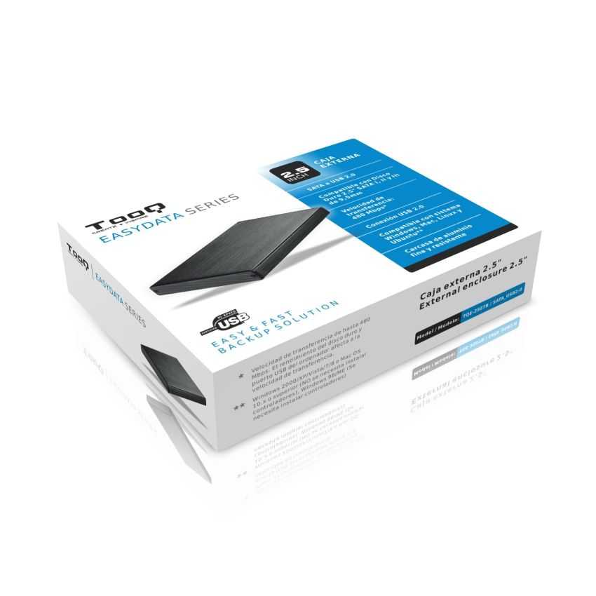 Especificaciones Número de unidades de almacenamiento compatibles: 1 Tipos de unidades de almacenamiento admitidas: Unidad de disco duro Interfaces de disco de almacenamiento soportados: SATA, Serial ATA II, Serial ATA III Tamaño de la unidad de almacenamiento: 6,35 cm (2.5") Altura de la unidad de almacenamiento: 9,5 mm Conexión USB: Si Versión USB: 2.0 Género del conector USB: Femenino Cantidad de puertos USB: 1 Color del producto: Negro Indicadores LED: Operación Materiales: Aluminio Velocidad de transferencia de datos: 0,48 Gbit/s Sistemas de archivos soportados: ext2, FAT32, HFS, NTFS Sistemas operativos compatibles: - Windows 98/2000/XP/VISTA/Win7 - Mac OS 9.x + - Linux/Ubuntu Peso: 80g Ancho: 7,6 cm Profundidad: 13 cm Altura: 1,2 cm Ancho del paquete: 13 cm Profundidad del paquete: 17,4 cm Altura del paquete: 4 cm Peso del paquete: 200g Manual de usuario: Si Tornillos incluídos: Si Cables incluidos: USB