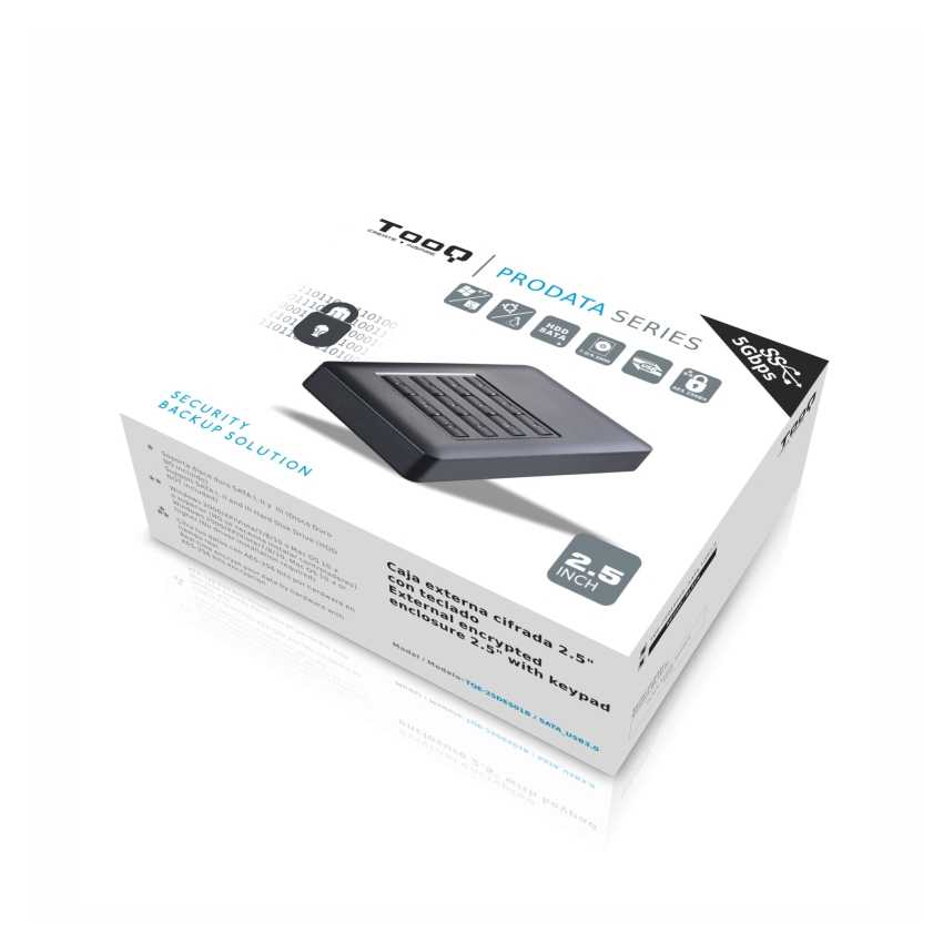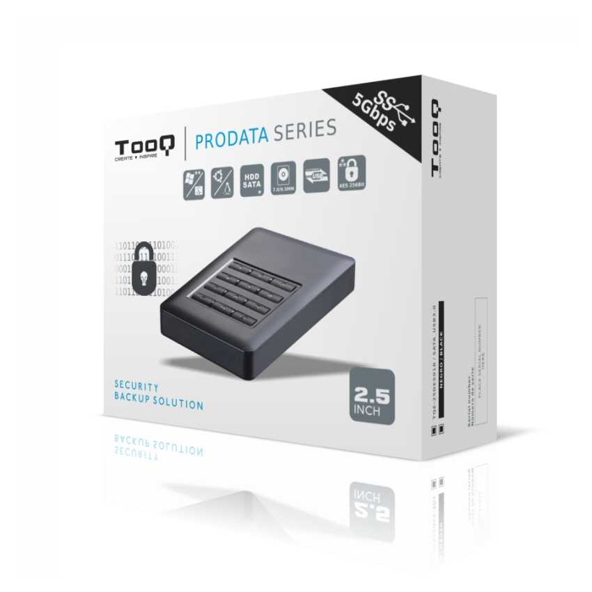 Especificaciones Máxima seguridad. Encriptación de datos AES-256 bits por hardware en tiempo real Teclado integrado Carcasa compatible con discos duros de 2,5" SATA I, II y III de hasta 7/9.5 mm de alto Conexión USB 3.0, bajo compatible con USB 2.0 y 1.1 Velocidad de transferencia de hasta 5.0Gbps Capacidad máxima de HDD soportada: 2.0 TB (Sistema de 32 bits) y 3.0 TB o superior (Sistema de 64 bits) Velocidad de HDD soportada: 4200RPM / 5400RPM / 7200RPM Tipo de formatos soportados: FAT32 / NTFS / eXT2 / HFS Sistemas operativos soportados: Windows 2000 / XP / VISTA / Win7/8/10 y MAC OS 9.X o superior y sistemas Linux y Ubuntu Indicadores LED de encendido y funcionamiento Material: aluminio y ABS Medidas: 76x124x13mm Peso: 100 grs Color: Negra