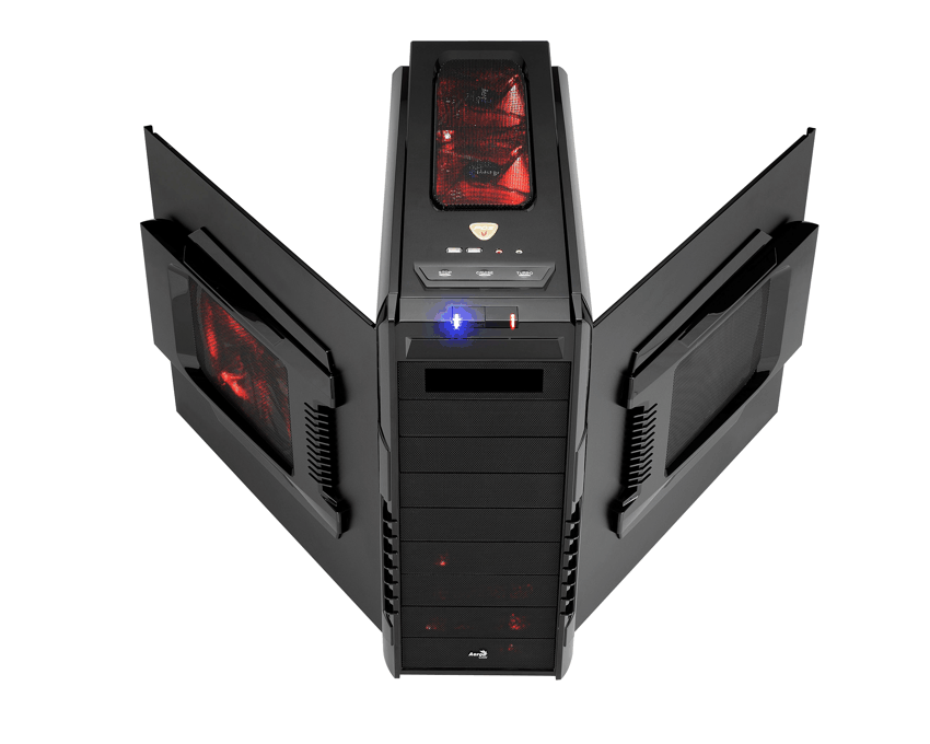 La Vx9-Pro LE es lo que sueña todo jugador. El chasis está sólidamente construido con acero japonés de 0.6mm y un espectacular acabado interior con todo el chasis completamente negro. Lo qué hace que esta caja destaque de sus competidoras es su rendimiento, facilidad de uso y capacidad de expansión. La Vx9-Pro LE soporta la gama alta de tarjetas VGA de hasta 307mm y tiene suficiente capacidad de expansión para soportar 9 dispositivos de 5 ¼ , 1 x 3.5” y 4 x HDDs (max). Los agujeros para la refrigeración líquida están pre-taladrados para soportar sistemas de refrigeración líquida de gama alta. El flujo de aire se maximiza con 6 ventiladores. Un ventilador en el frontal de entrada, de 12cm con led rojo (incluido), un ventilador de salida en la parte trasera de 12 cm con led rojo (incluido), 2 ventiladores en la parte superior (incluido) y un ventilador lateral de 20cm con led rojo (incluido). Hay una opción adicional para instalar otro ventilador más de 12 cm en la parte inferior del chasis. Esta caja también viene con un controlador LED de ventiladores con "3 velocidades“, para controlar todos los ventiladores dentro del chasis. El chasis es completamente sin tornillos lo cual hace que la instalación sea sencilla