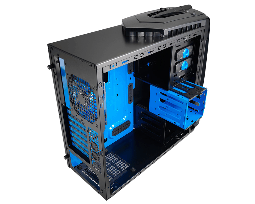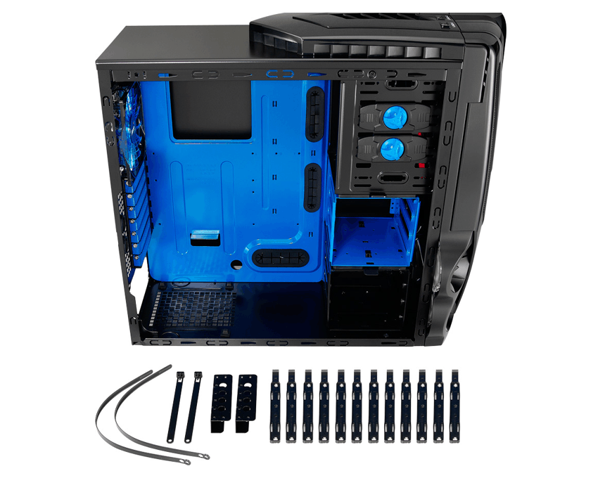 Está sólidamente construida por acero japonés SECC de 0.6 mm y pintada totalmente en negro y azul, pero para un contraste atractivo.