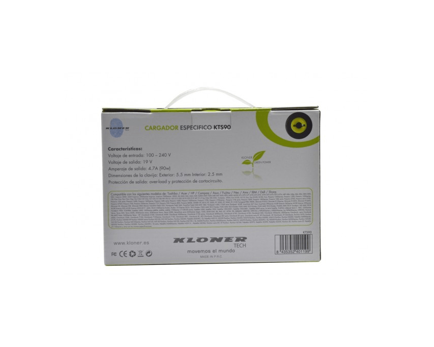 Voltaje de entrada:100 -240 V Voltaje de salida: 19V Amperaje de salida: 4’74A (90w) Dimensiones de la clavija Exterior: 5.5 mm Dimensiones de la clavija Interior: 2.5 mm Protección de salida: over-load Protección de cortocircuito