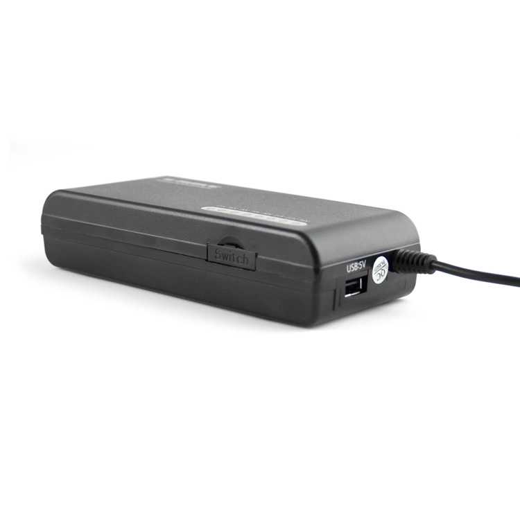 Cargador 2 en 1 para portátiles y dispositivos USB. Incluye un puerto USB para cargar dispositivos USB y selección manual del voltaje.
