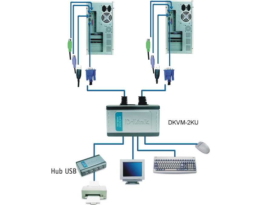 El dispositivo DKVM-2KU de dos puertos para teclado, video, y mouse (KVM) es un conmutador que permite controlar 2 ordenadores diferentes utilizando un solo teclado, monitor y mouse, además incorpora un puerto USB 2.0 que le permite compartir a dos ordenadores un mismo dispositivo que disponga de conexión USB. El DKVM-2KU proporciona características que hacen de esta unidad una solución económica, poderosa y fácil de utilizar. Está orientado a ofrecer soluciones para usuarios residenciales y para pequeñas oficinas.