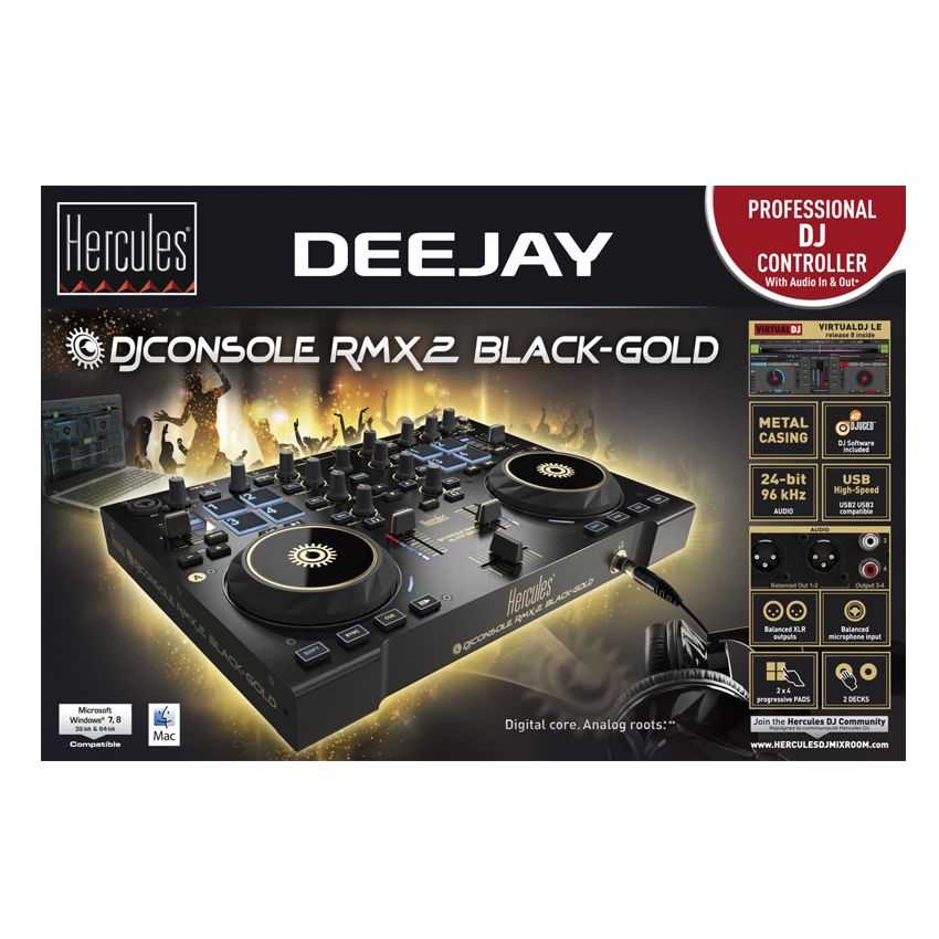 Descripción Hercules DJ Console RMX2. Procesamiento digital del sonido: 24 bit, Frecuencia de muestreo: 96 kHz. Ancho: 33 cm, Profundidad: 25 cm, Altura: 22,8 cm. Sistema operativo Windows soportado: Windows 7 Enterprise x64, Windows 7 Home Basic x64, Windows 7 Home Premium, Windows 7 Home Premium x, Sistema operativo MAC soportado: Mac OS X 10.0 Cheetah, Mac OS X 10.7 Lion, Mac OS X 10.8 Mountain Lion, Procesador mínimo: Athlon 64 X2