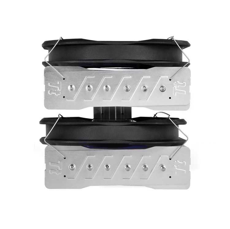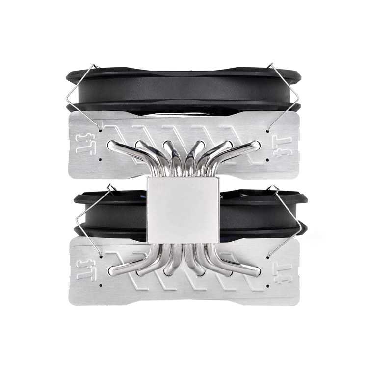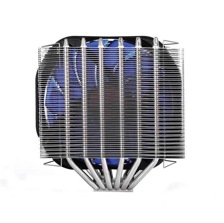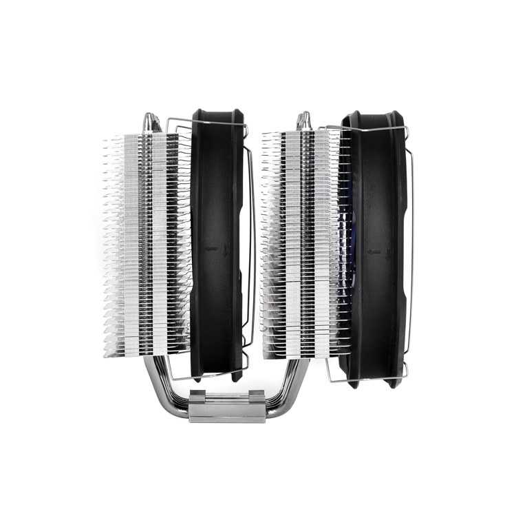 Cooler para CPU compatible con Intel y AMD con 6 heatpipes de 6 mm, aletas de aluminio de 0.4 mm y dos ventiladores de aspas azules de 140 mm que aceleran la conducción del calor. Incluye un controlador externo para la velocidad, con opción manual (VR) y automática (PWM).