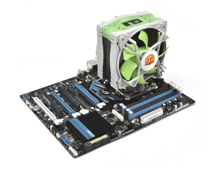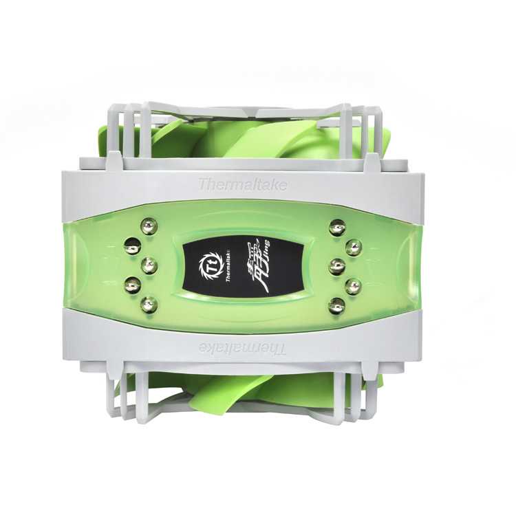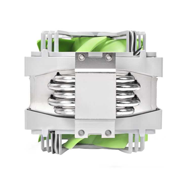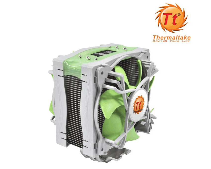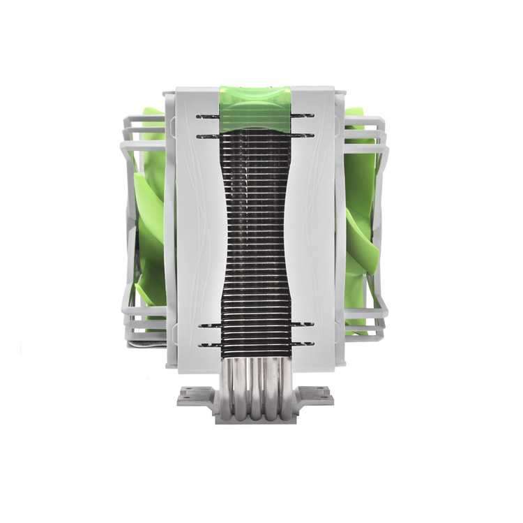 Cooler para CPU con dos ventiladores de 120 mm de aspas verdes preinstalados.