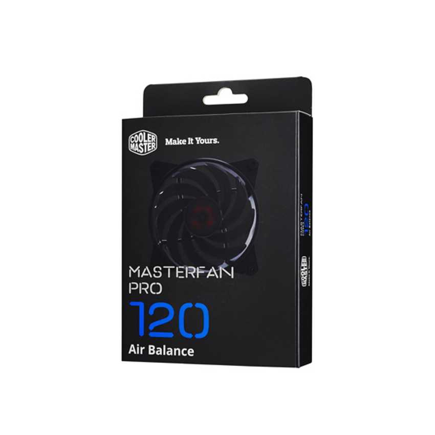 Descripción Cooler Master MasterFan Pro 120 Air Balance. Adecuado para: Carcasa del ordenador, Tipo: Ventilador, Diámetro de ventilador: 12 cm. Color del producto: Negro. Intensidad nominal: 0,23 A. Peso: 146 g, Dimensiones del ventilador (A x A x P): 120 x 120 x 25 mm