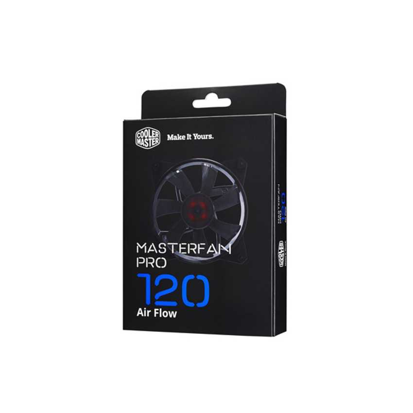 Descripción Cooler Master MasterFan Pro 120 Air Flow. Adecuado para: Carcasa del ordenador, Tipo: Ventilador, Diámetro de ventilador: 12 cm. Color del producto: Negro. Dimensiones del ventilador (A x A x P): 120 x 120 x 25 mm, Peso de ventilador: 147 g
