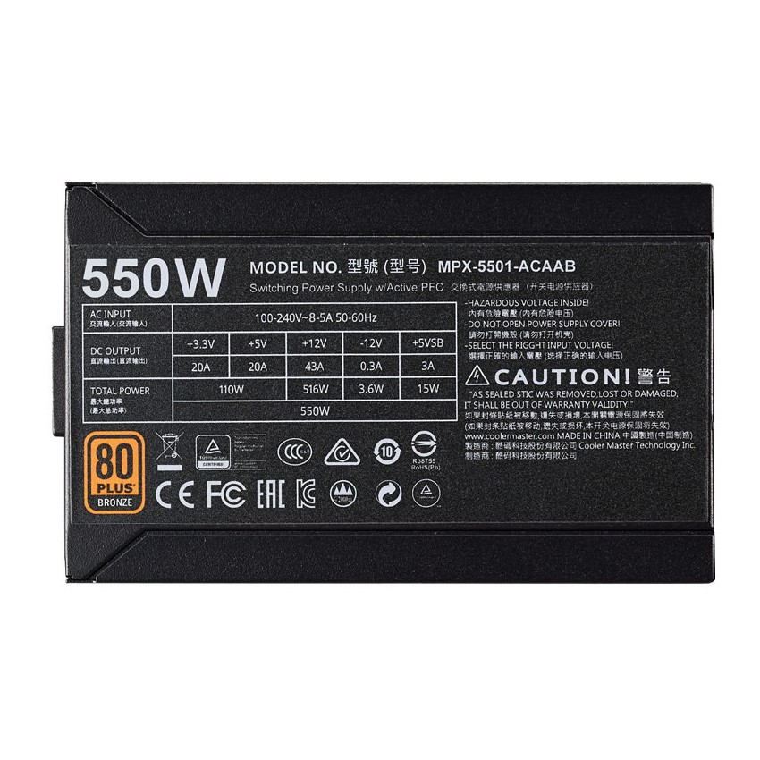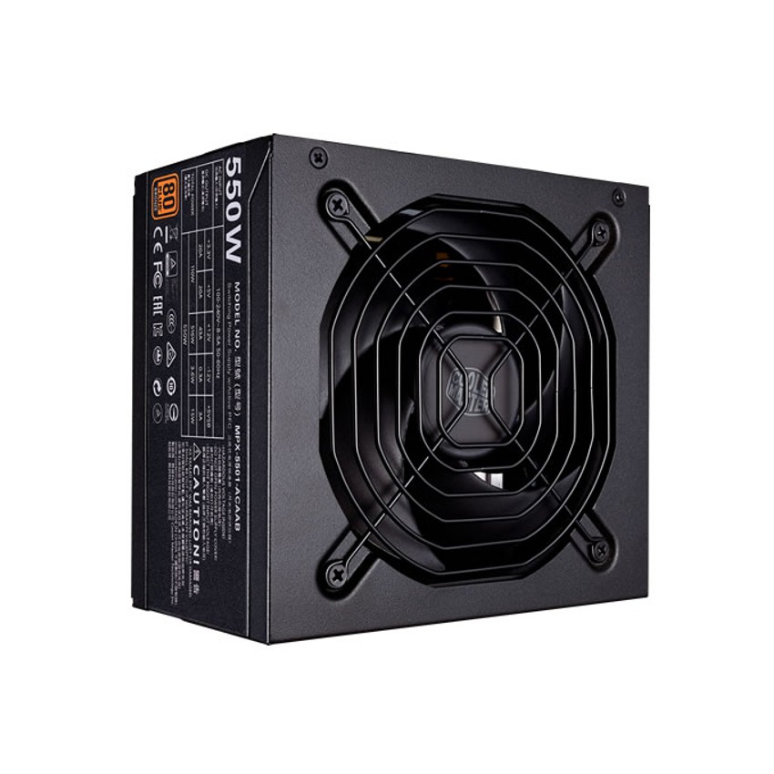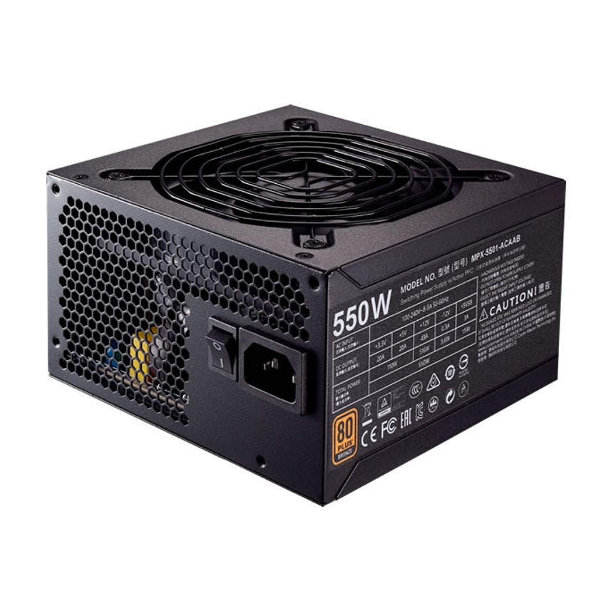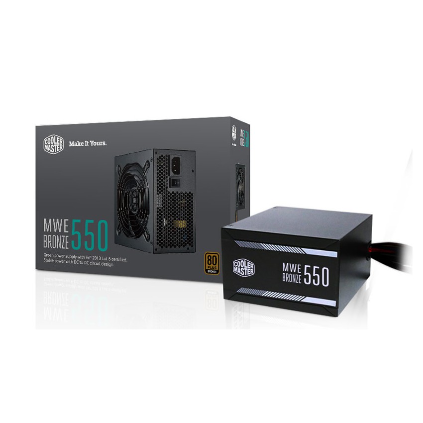 Descripción Cooler Master MWE Bronze 550. Potencia total: 550 W, Voltaje de entrada AC: 100 - 240, Frecuencia de entrada AC: 50 - 60. Diámetro de ventilador: 12 cm, Número de ventiladores: 1 Ventilador(es). Alimentador de energía para tarjeta madre: 20+4 pin ATX, Longitud del cable de alimentación de la placa base: 61 cm, Longitud del cable de alimentación SATA: 450,570 mm. Factor de forma: ATX, Utilizar con: PC, Tiempo medio entre fallos: 100000 h. Color del producto: Negro