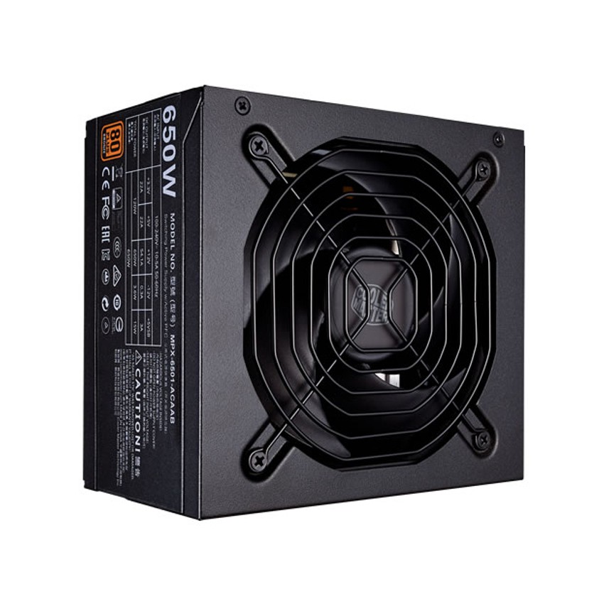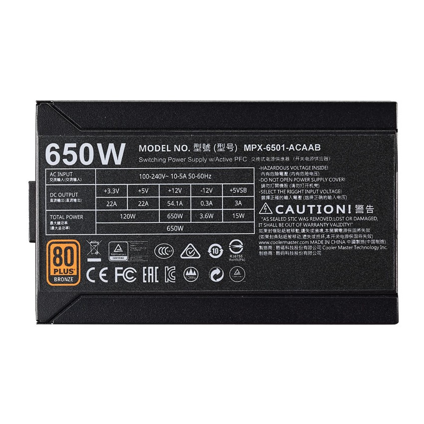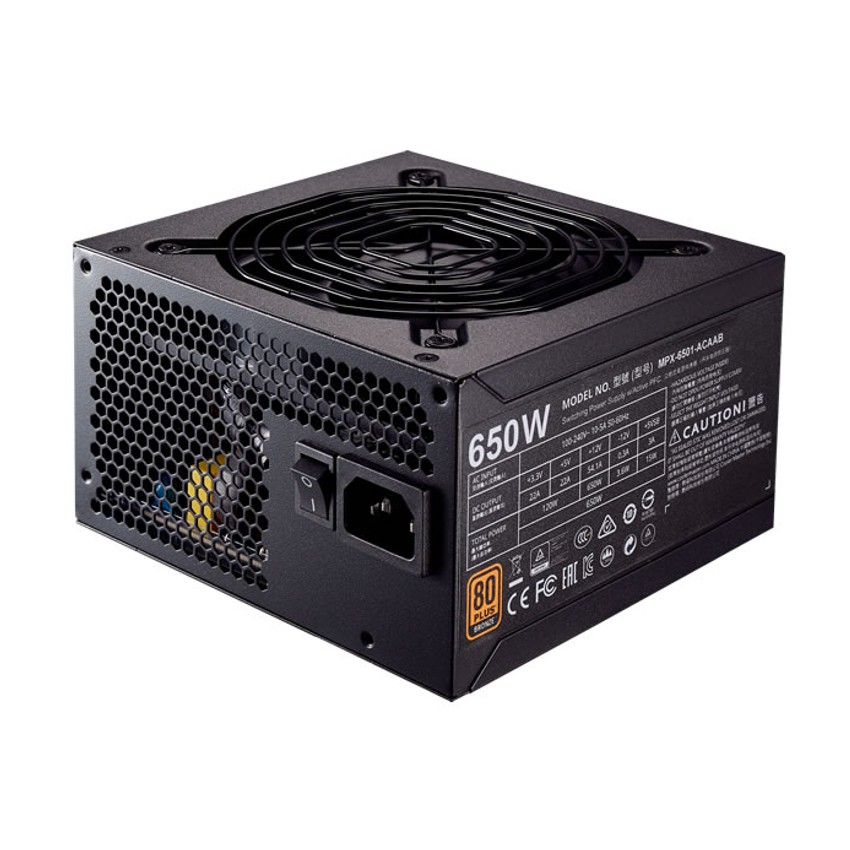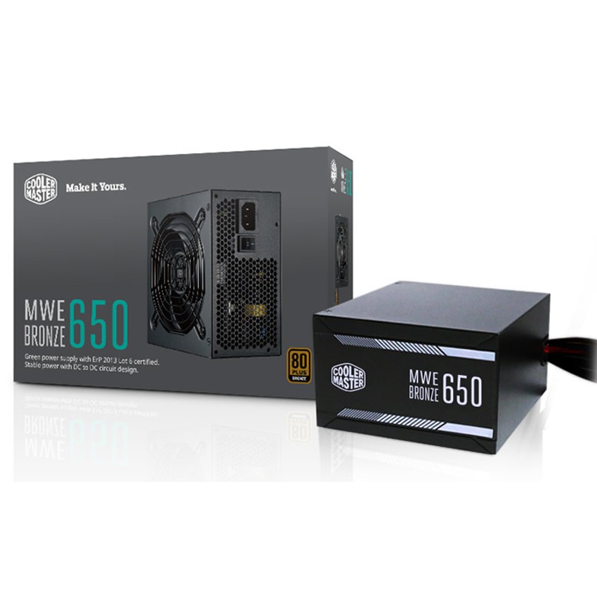 Descripción Cooler Master MWE Bronze 650. Potencia total: 650 W, Voltaje de entrada AC: 100 - 240, Frecuencia de entrada AC: 50 - 60. Diámetro de ventilador: 12 cm, Número de ventiladores: 1 Ventilador(es). Alimentador de energía para tarjeta madre: 20+4 pin ATX, Longitud del cable de alimentación de la placa base: 61 cm, Longitud del cable de alimentación SATA: 810,450,570,690 mm. Factor de forma: ATX, Utilizar con: PC, Tiempo medio entre fallos: 100000 h. Color del producto: Negro