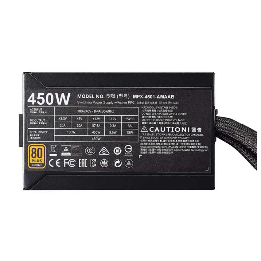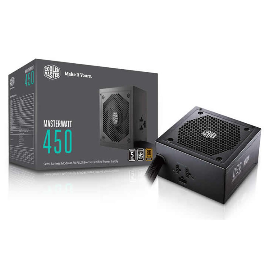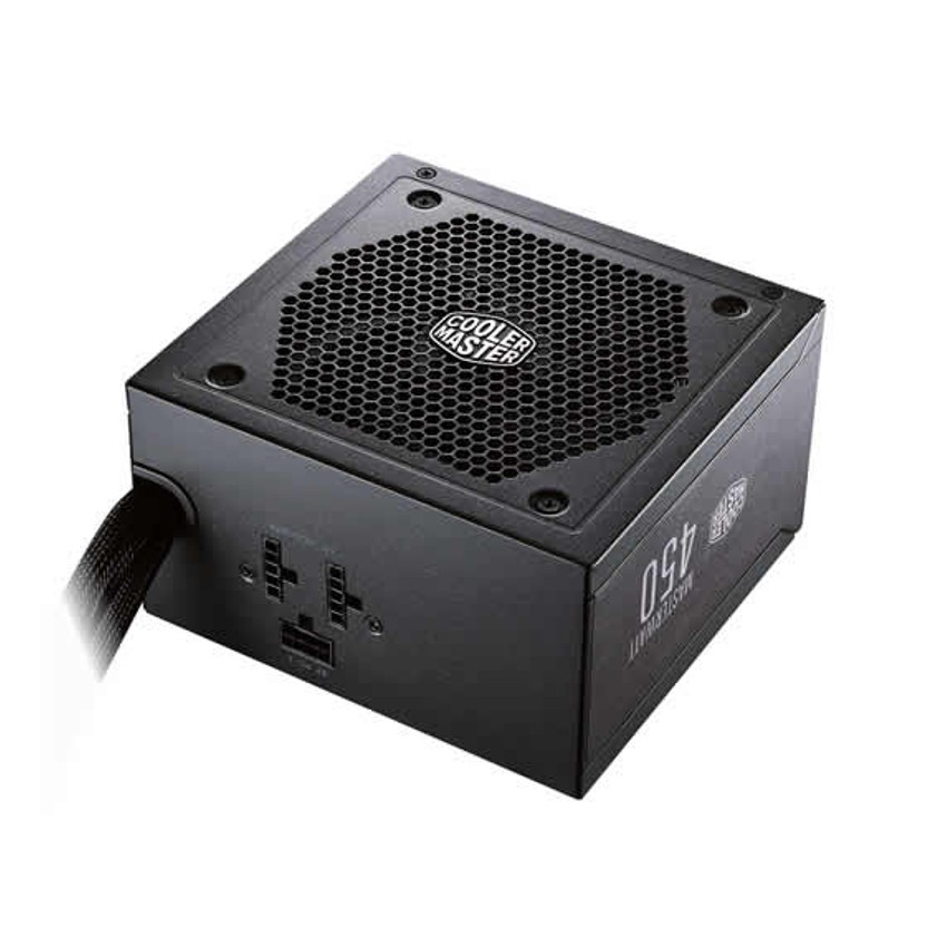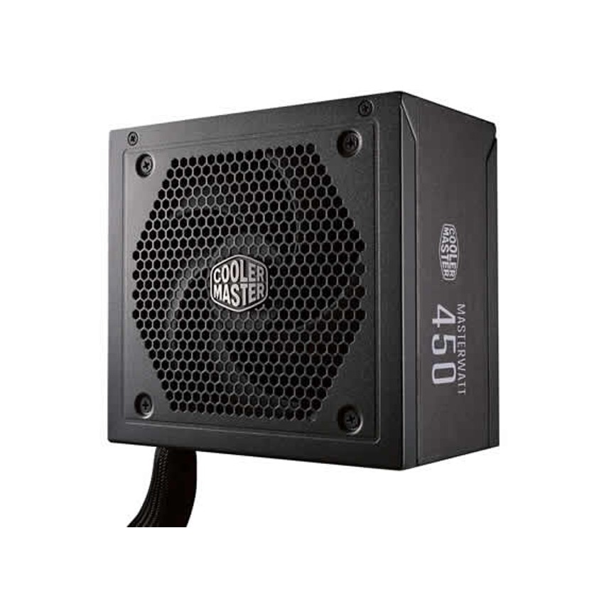 Descripción Cooler Master MasterWatt 450. Potencia total: 450 W, Voltaje de entrada AC: 100 - 240, Frecuencia de entrada AC: 50 - 60. Diámetro de ventilador: 12 cm, Número de ventiladores: 1 Ventilador(es). Alimentador de energía para tarjeta madre: 24-pin ATX, Longitud del cable de alimentación de la placa base: 55 cm, Longitud del cable de alimentación SATA: 500,860 mm. Factor de forma: ATX, Utilizar con: PC, Tiempo medio entre fallos: 100000 h. Color del producto: Negro