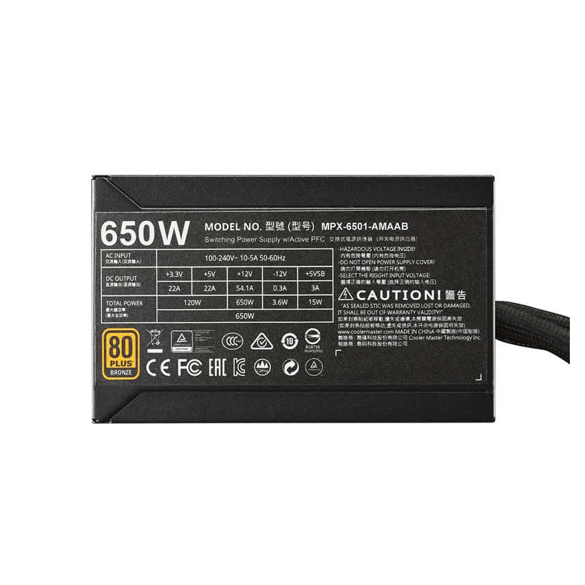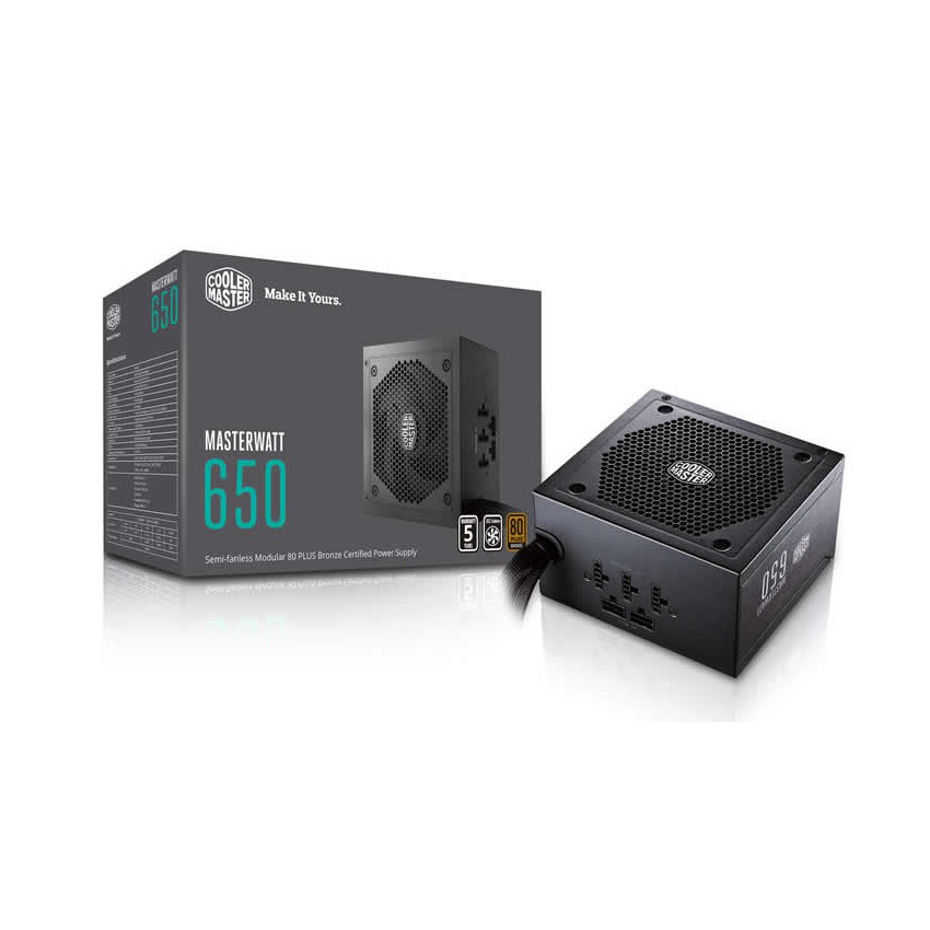 Descripción Cooler Master MasterWatt 650. Potencia total: 650 W, Voltaje de entrada AC: 100 - 240, Frecuencia de entrada AC: 50 - 60. Diámetro de ventilador: 12 cm, Número de ventiladores: 1 Ventilador(es). Alimentador de energía para tarjeta madre: 24-pin ATX, Longitud del cable de alimentación de la placa base: 55 cm, Longitud del cable de alimentación SATA: 500,860 mm. Factor de forma: ATX, Utilizar con: PC, Tiempo medio entre fallos: 100000 h. Color del producto: Negro