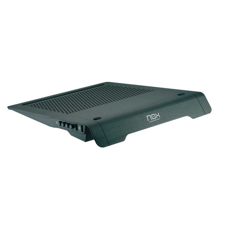 Cooler para portátiles de 15'' con superficie microperforada y tres ventiladores de 80 mm. Incluye 2 puertos USB para conectar otros dispositivos.