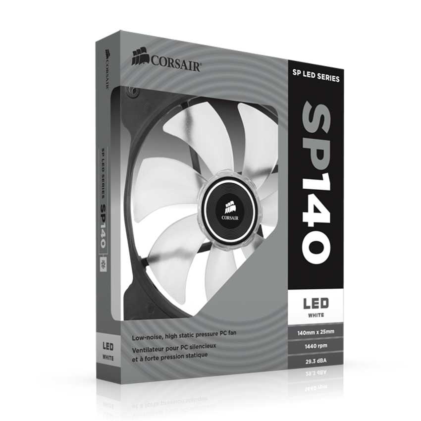 Descripción Corsair SP140 LED, Air. Adecuado para: Carcasa del ordenador, Tipo: Ventilador, Diámetro de ventilador: 14 cm. Color del producto: Negro, Iluminación: LED, Iluminación de color: Color blanco. Voltaje: 7 - 12