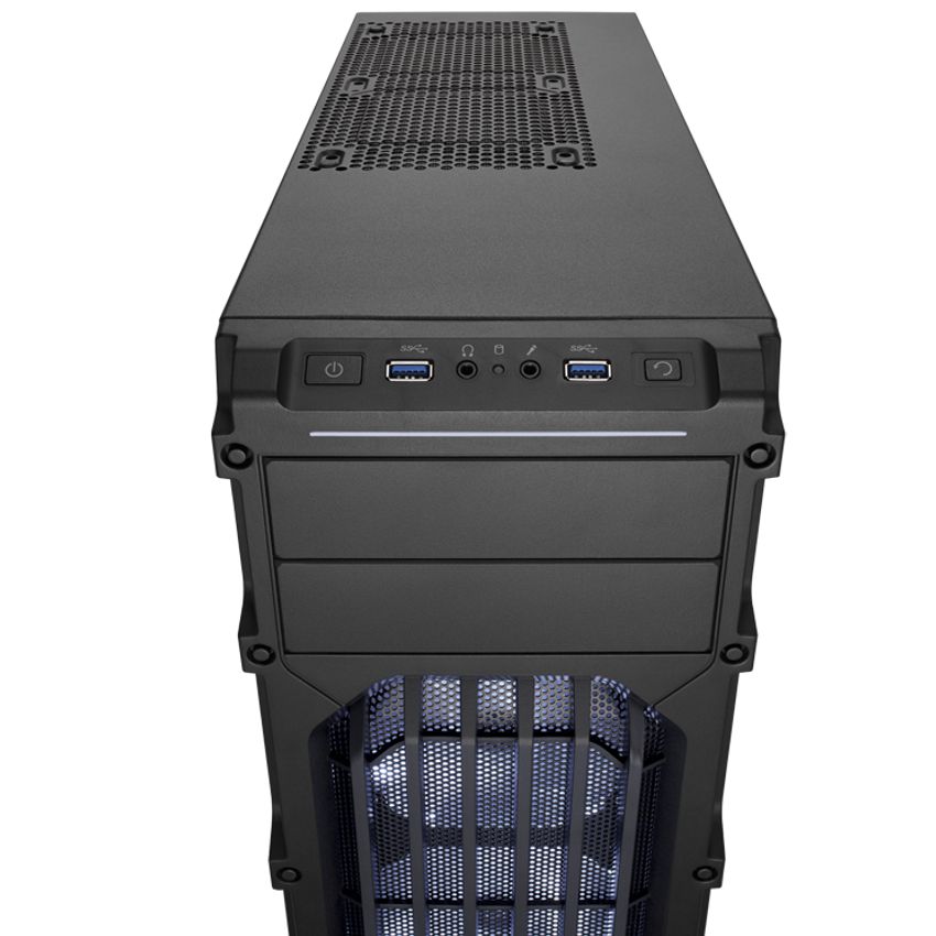 Especificaciones Factor de forma: Midi-Tower Tipo: PC Materiales: Acero Número de puertos 5.25": 2 Número de puertos 3.5": 3 Formas de factor de tarjeta madre soportadas: ATX, Micro-ATX, Mini-ITX Color del producto: Negro Número de bahías 2.5: 2 Número de bahías internas de 3,5 ": 3 Número de receptáculos 5.25" externos: 2 Ventana lateral: Si Adecuado para: Juego Iluminación: Si Iluminación ubicación: Frente Iluminación de color: Azul Altavoces incorporados: No Número de ranuras de expansión: 7 Altura máxima de la CPU más fresco: 15,7 cm Máxima longitud de la tarjeta de gráficos: 42 cm Máxima longitud de PSU: 28,8 cm Fuente de alimentación incluida: No Ubicación de fuente de alimentación: Fondo Cantidad de puertos tipo A USB 3.0 (3.1 Gen 1): 2 Entrada de audio: Si Salida de audio: Si Ventiladores frontales instalados: 1x 120 mm Máximo de ventiladores frontales: 2 Diámetro de ventiladores frontales soportados: 120,140 mm Ventiladores traseros instalados: 1x 120 mm Máximo de ventiladores posteriores: 1 Diámetro de ventiladores traseros soportados: 120 mm Máximos ventiladores superiores: 2 Diámetros de ventiladores superiores soportados: 120 mm Máximos ventiladores inferiores: 1 Diámetro de ventiladores inferiores secundarios soportados: 120 mm Capacidad de enfriamiento líquido: Si Tamaños de disco duro soportados: 2.5,3.5" Número de discos duros soportados: 5 Gestión de cables: Si Botón de restaurar: Si Ancho: 21,5 cm Profundidad: 49,3 cm Altura: 42,6 cm Peso: 5 kg