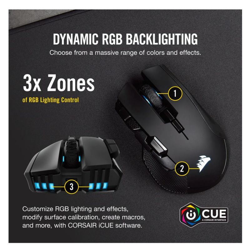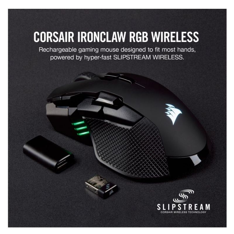 Descripción Corsair IRONCLAW RGB. Factor de forma: mano derecha. Tecnología de detección de movimientos: Óptico, Interfaz del dispositivo: RF Wireless+Bluetooth+USB Type-A, Resolución de movimiento: 18000 DPI, Tipo de botones: Botones presionados, Cantidad de botones: 10, Tipo de desplazamiento: Rueda. Iluminación de color: Multi. Fuente de energía: Baterías/Cable. Color del producto: Negro