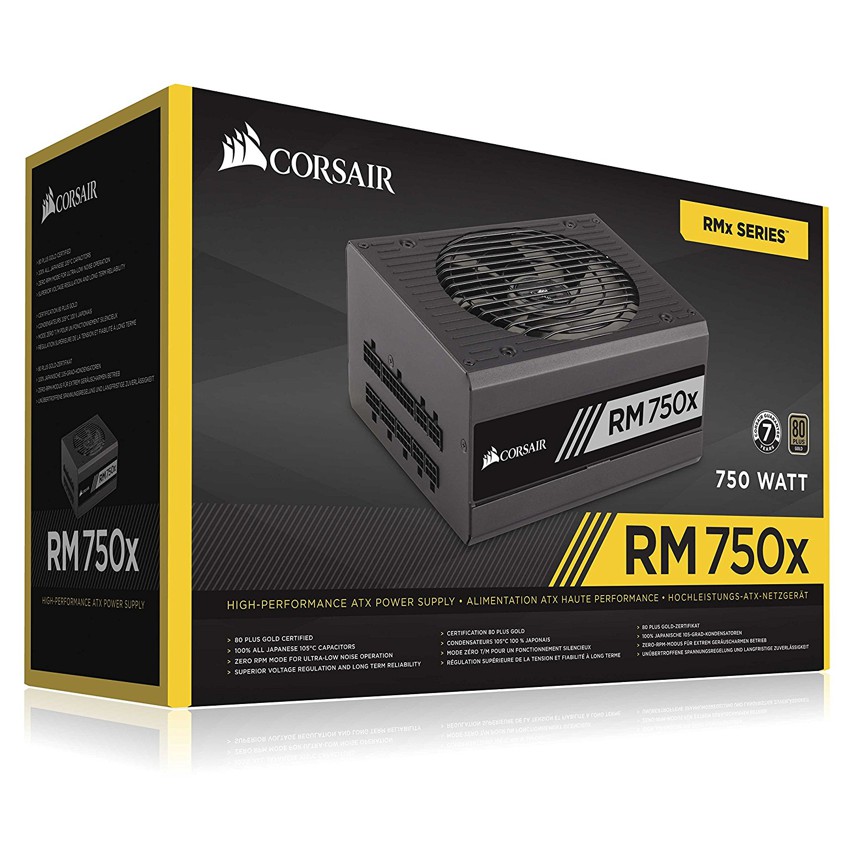 Descripción Corsair RM750x. Potencia total: 750 W, Voltaje de entrada AC: 100 - 240, Máxima energía: 825 W. Diámetro de ventilador: 13,5 cm, Número de ventiladores: 1 Ventilador(es), Ubicación de ventilador: Superior. Alimentador de energía para tarjeta madre: 20+4 pin ATX, Longitud del cable de alimentación de la placa base: 61 cm, Longitud del cable de alimentación PCI Express: 75 cm. Utilizar con: PC, Factor de forma de fuente de alimentación (PSU): ATX, Temperatura nominal de salida continua: 50 °C. Color del producto: Negro