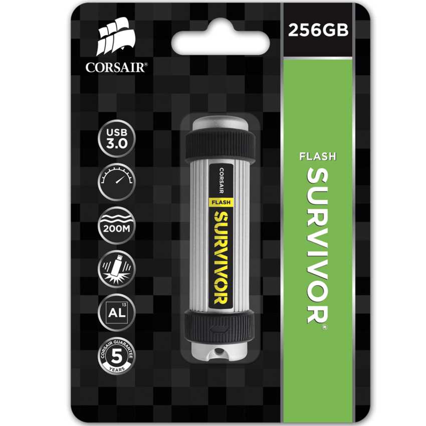 Descripción Corsair Flash Survivor 256GB USB 3.0. Capacidad: 256 GB, Versión USB: USB 3.0 (3.1 Gen 1), Conector USB: Type-A. Factor de forma: Sin tapa, Color del producto: Negro, Gris, Funciones de protección: Resistente a golpes, Resistente a las vibraciones, Resistente al agua. Peso: 37 g