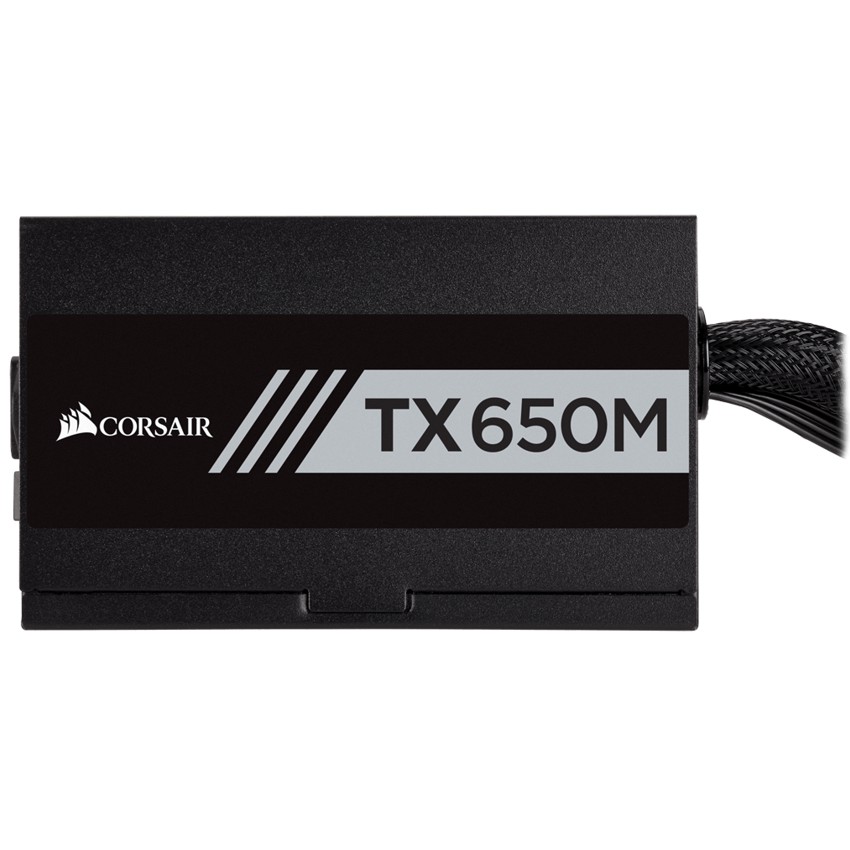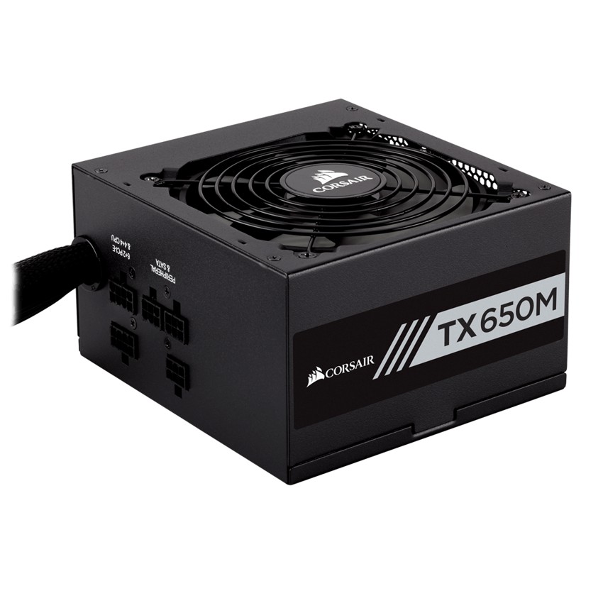 Descripción Corsair TX650M. Voltaje de entrada AC: 100 - 240 V, Frecuencia de entrada AC: 47 - 63 Hz, Corrección del factor de potencia tipo (PFC): Activo. Ubicación de ventilador: Superior, Tipo de enfriamiento: Activo. Alimentador de energía para tarjeta madre: 20+4 pin ATX, Tipo de cableado: Semimondular. Factor de forma: ATX, Utilizar con: PC, Tecnología de rodamientos: Rifle. Color del producto: Negro
