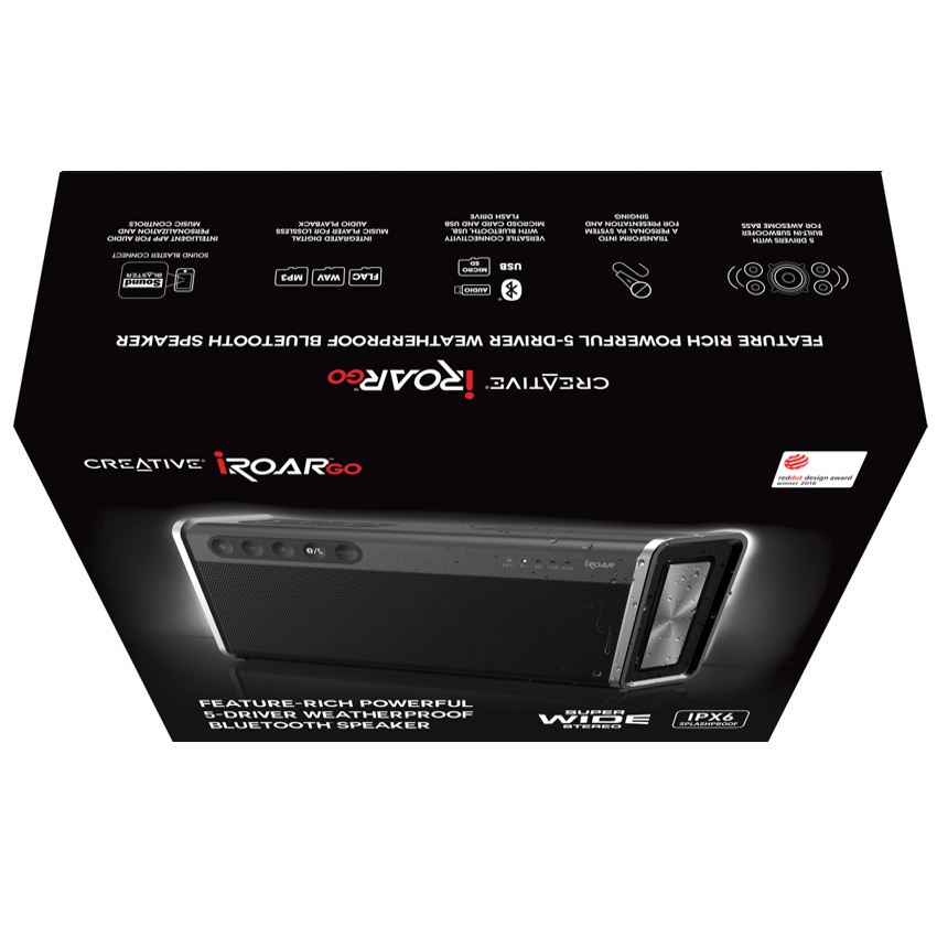 Descripción Creative Labs iRoar Go. Diámetro del conductor del subwoofer (imperial): 6,35 cm (2.5"), Diámetro del tweeter: 3,81 cm (1.5"). Tecnología de conectividad: Inalámbrico y alámbrico, Interfaz: Bluetooth/3.5mm/USB, Tecnología inalámbrica: Bluetooth. Tipo de producto: Estéreo, Color del producto: Negro, Diseño: Rectángulo. Uso recomendado: Universal. Alimentación: Batería, Tipo de batería: Integrado, Autonomía: 12 h