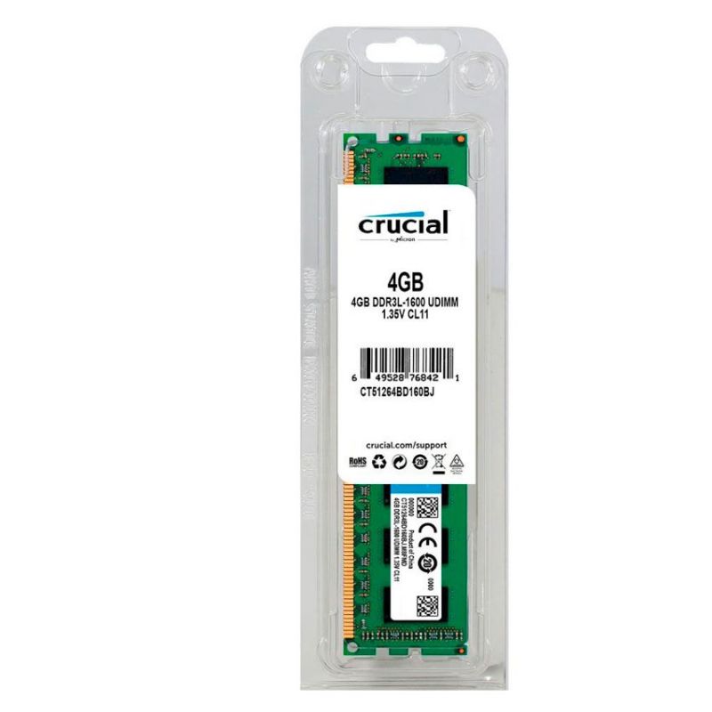 Descripción Crucial 4GB DDR3L PC3-12800. Memoria interna: 4 GB, Diseño de memoria (módulos x tamaño): 1 x 4 GB, Tipo de memoria interna: DDR3L, Velocidad de memoria del reloj: 1600 MHz, Forma de factor de memoria: 240-pin DIMM, Latencia CAS: 11