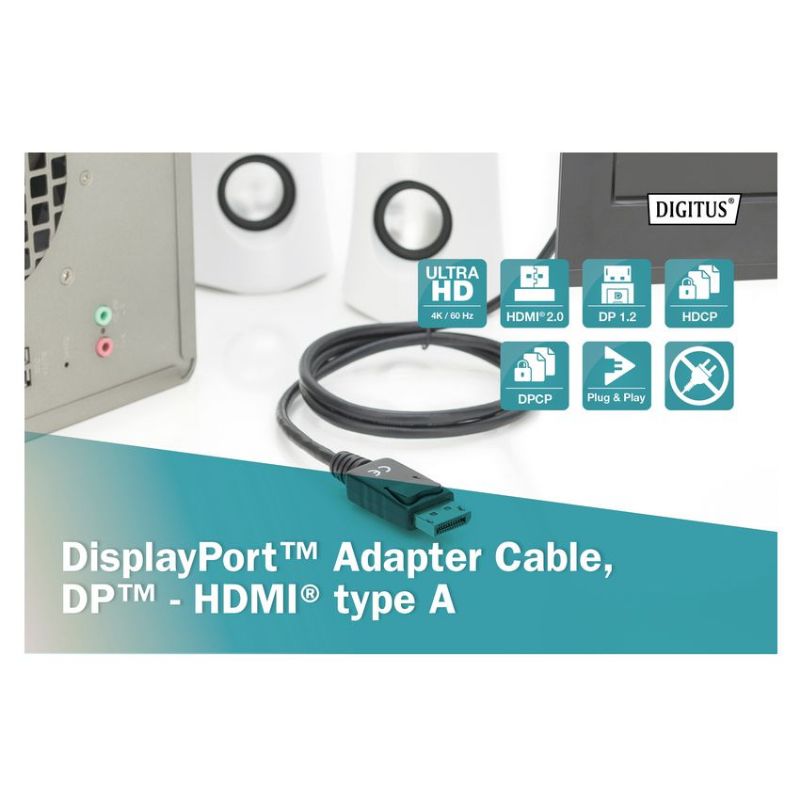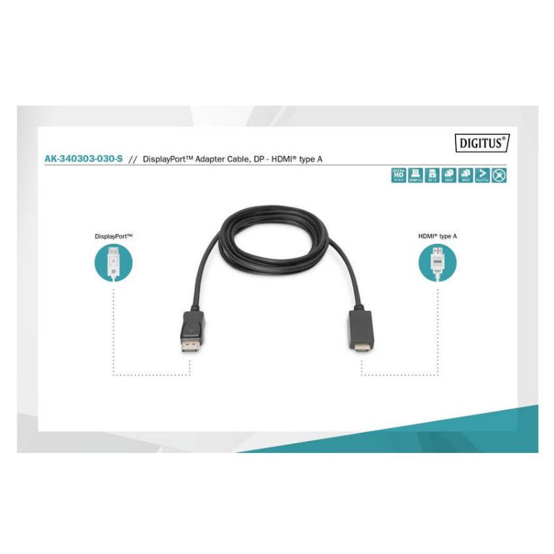 Descripción ASSMANN Electronic AK-340303-030-S. Longitud de cable: 3 m, Conector 1: HDMI tipo A (Estándar), Conector 2: DisplayPort. Cantidad por paquete: 1 pieza(s), Tipo de embalaje: Bolsa de plástico. Ancho de la caja principal: 32 cm, Longitud de la caja: 50 cm, Alto de la caja principal: 21 cm