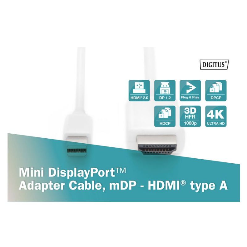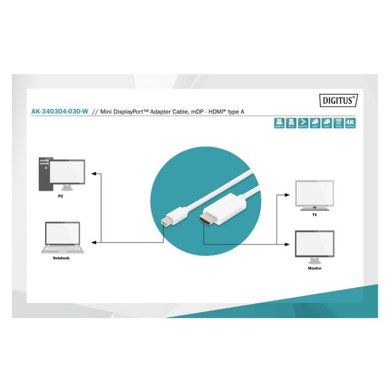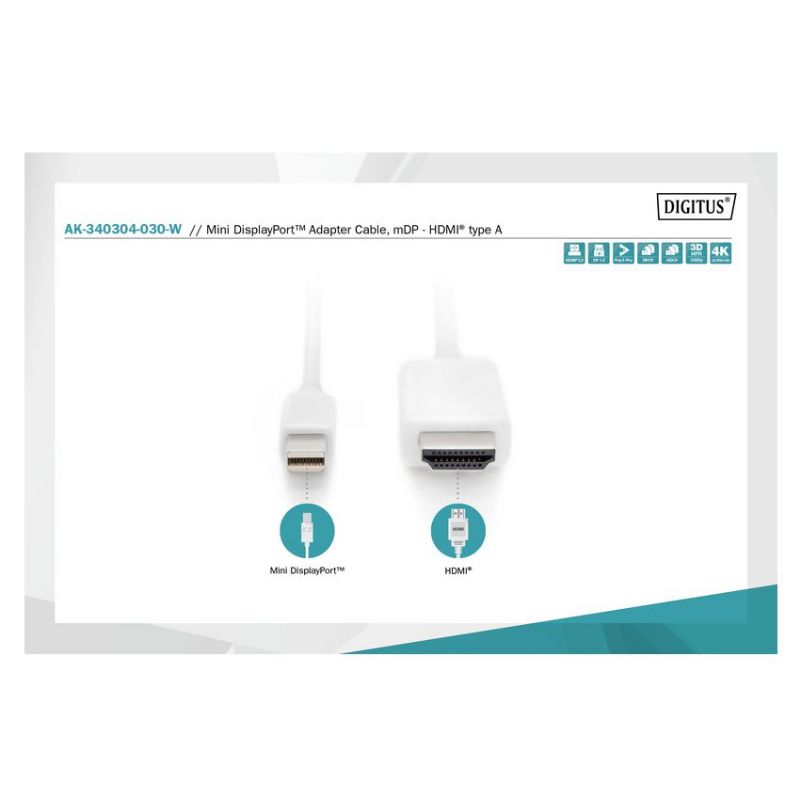 Descripción ASSMANN Electronic AK-340304-030-W. Longitud de cable: 3 m, Conector 1: Mini DisplayPort, Conector 2: HDMI tipo A (Estándar). Cantidad por paquete: 1 pieza(s), Tipo de embalaje: Bolsa de plástico. Ancho de la caja principal: 32 cm, Longitud de la caja: 50 cm, Alto de la caja principal: 21 cm