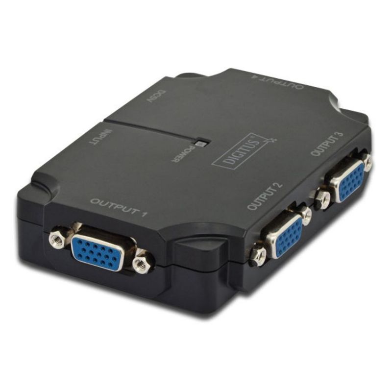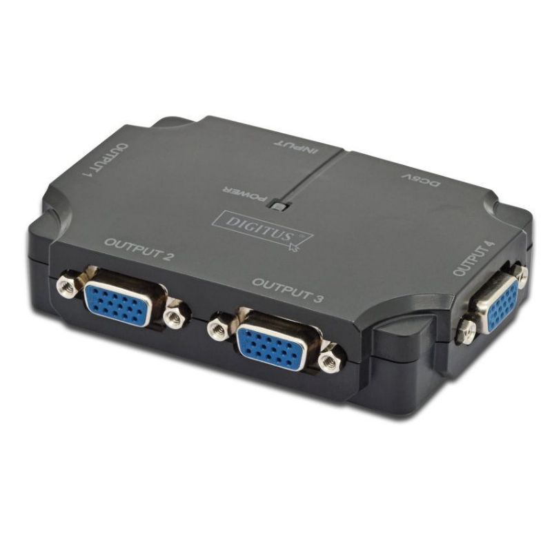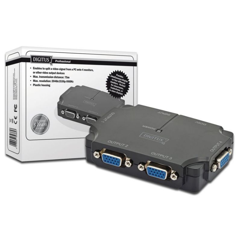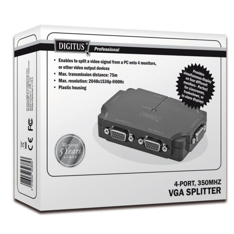 Descripción Digitus VGA 350MHz, 4-Port. Tipo de puerto de vídeo: VGA, Salida de vídeo: 4x VGA. Máxima resolución: 2048 x 1536 Pixeles, Color del producto: Negro, Distancia de funcionamiento máximo: 75 m. Voltaje de entrada: 5 V. Longitud del paquete: 10 cm, Ancho del paquete: 135 mm, Altura del paquete: 30 mm