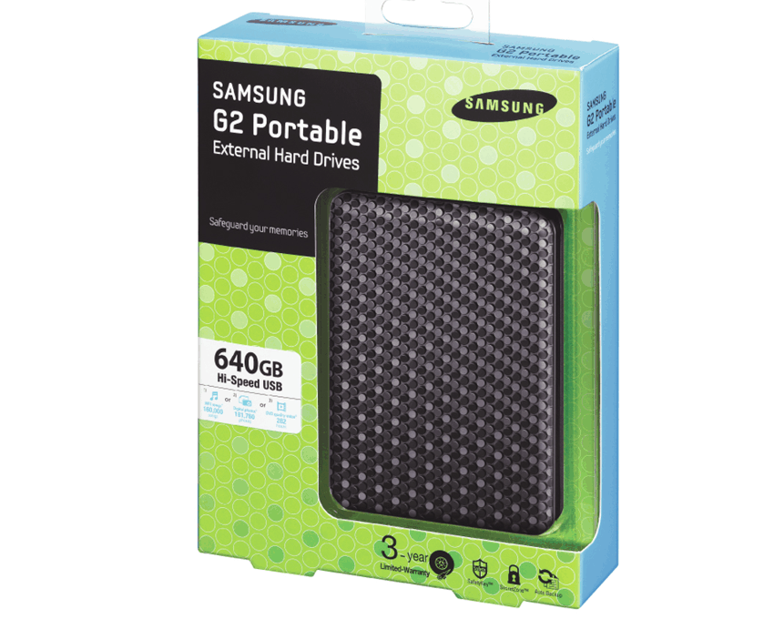 Samsung G2 Portable 640GB G series, 640 GB, 5400 RPM, USB 2.0, 6.35 cm (2.5 "), 8 MB, 146 g Samsung G2 Portable 640GB, G series. Accionamiento de disco: 640 GB, 5400 RPM, USB 2.0, 6.35 cm (2.5 "), 8 MB. Peso y dimensiones: 146 g, 111.3 mm, 17 mm, 79 mm. Condiciones ambientales: 5 - 40 °C, -20 - 65 °C