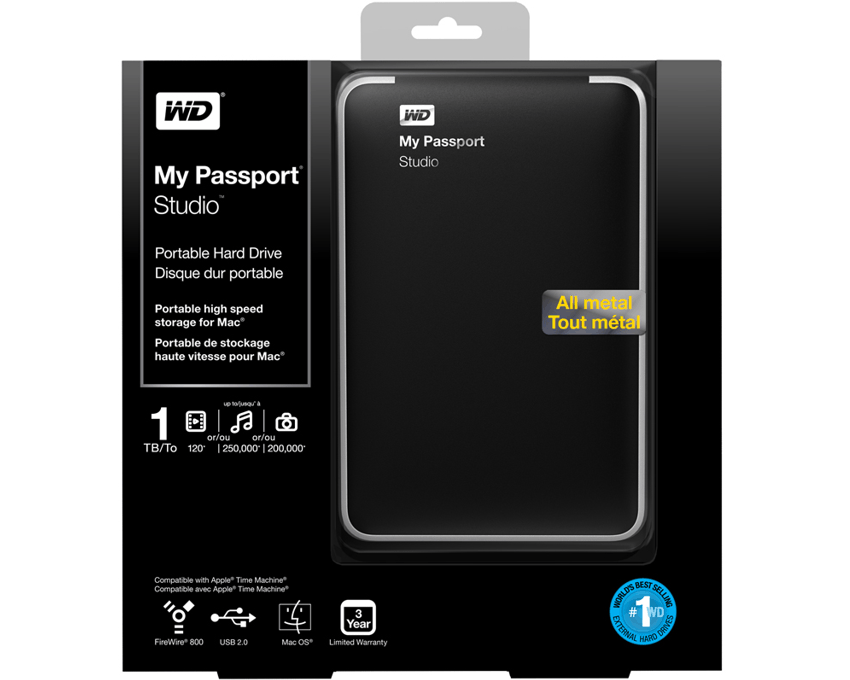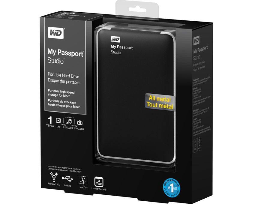1TB My Passport Studio USB 2.0, 2 x FireWire 800Diseño metálico de gran capacidad. Al ofrecer una gran capacidad en una pequeña carcasa metálica, My Passport Studio es el compañero ideal para el fotógrafo, el cámara de vídeo, el artista gráfico o el profesional creativo en cualquier lugar.Conexiones duales FireWire 800. Guarda y permite el acceso a datos con una velocidad increíblemente rápida de los dos puertos FireWire® 800 ultrarrápidos Use el segundo puesto FireWire para la conexión en serie de una unidad externa adicional u otro periférico para su MacBook.La protección mediante contraseña protege la unidad. WD Security? permite establecer la protección mediante contraseña y el cifrado mediante hardware y proteger los archivos contra usos o accesos no autorizados.