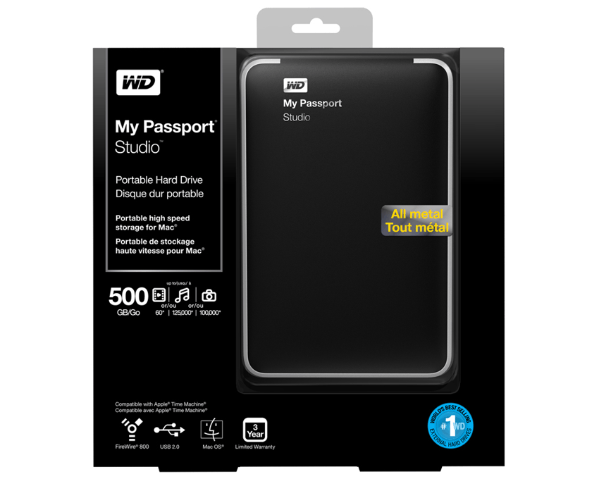 500GB My Passport Studio USB 2.0, 2 x FireWire 800Diseño metálico de gran capacidad. Al ofrecer una gran capacidad en una pequeña carcasa metálica, My Passport Studio es el compañero ideal para el fotógrafo, el cámara de vídeo, el artista gráfico o el profesional creativo en cualquier lugar.Conexiones duales FireWire 800. Guarda y permite el acceso a datos con una velocidad increíblemente rápida de los dos puertos FireWire® 800 ultrarrápidos Use el segundo puesto FireWire para la conexión en serie de una unidad externa adicional u otro periférico para su MacBook.La protección mediante contraseña protege la unidad. WD Security? permite establecer la protección mediante contraseña y el cifrado mediante hardware y proteger los archivos contra usos o accesos no autorizados.