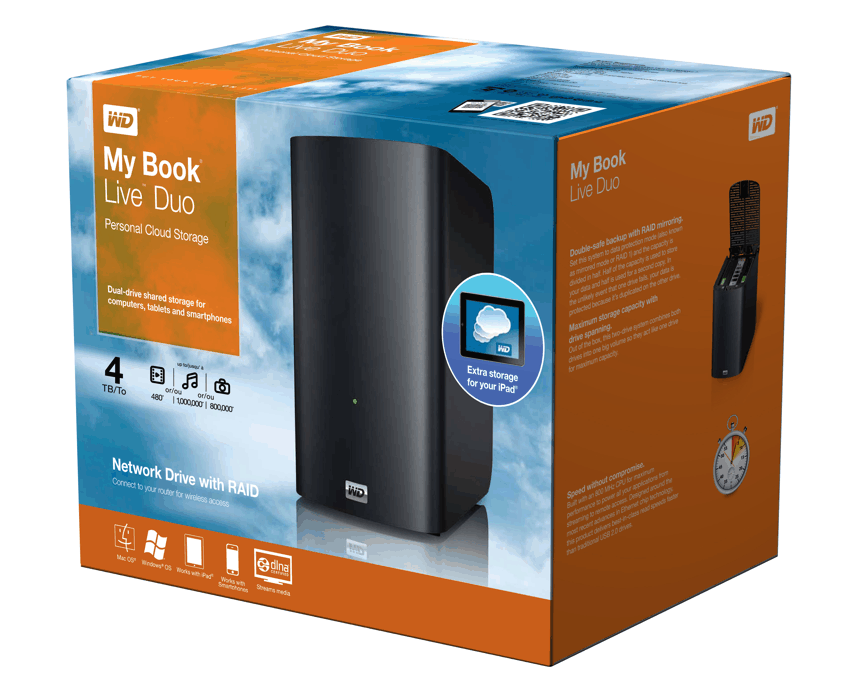Western Digital My Book Live Duo 4TB, 4000 GB, 1000 Mbit/s, Negro, 100-240 V, Mac OS X 10.5 Leopardo, Mac OS X 10.6 Leopardo de nieve, Mac OS X 10.7 Lion, 1090 g Western Digital My Book Live Duo 4TB. Accionamiento de disco: 4000 GB. Transmisión de datos: 1000 Mbit/s. Color: Negro. Contro de energía: 100-240 V. Sistema operativo/software: Mac OS X 10.5 Leopardo, Mac OS X 10.6 Leopardo de nieve, Mac OS X 10.7 Lion. Peso y dimensiones: 1090 g, 50 mm, 139 mm, 167 mm. Iluminación/Alarmas: HDD, Y. Condiciones ambientales: 5 - 35 °C, -20 - 65 °C. Aprobaciones reguladoras: RoHS, UPnP
