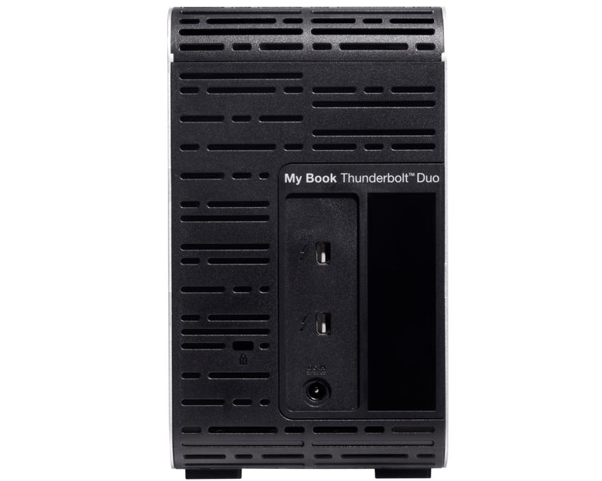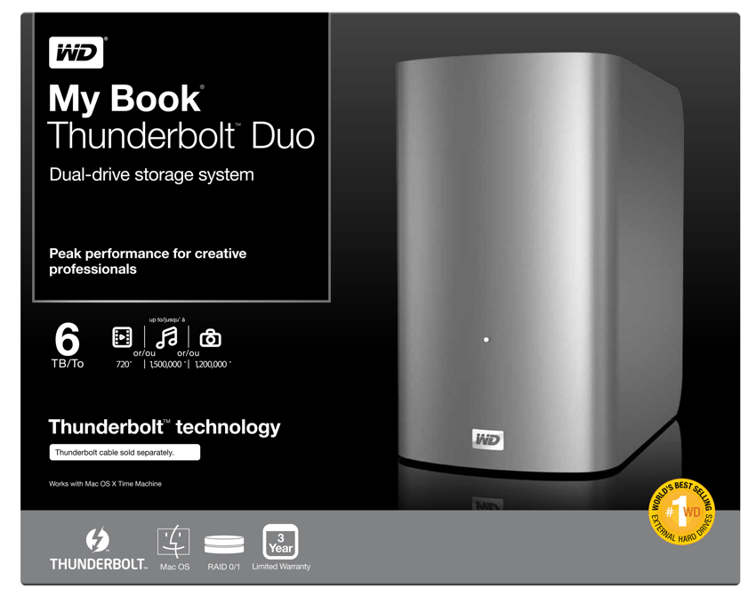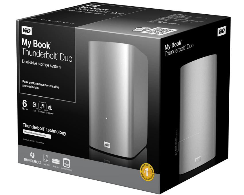 My Book Thunderbolt Duo 6TB, Thunderbolt, RAID 0/1, Mac OS X 10.6.8Mueva los datos a una velocidad sin precedentes Por fin un disco capaz de seguirle el ritmo a su creatividad. Los editores de vídeo y otros profesionales de medios digitales pueden hacer más trabajo en menos tiempo con la velocidad de transferencia de datos innovadora de los puertos Thunderbolt? en la unidad My Book Thunderbolt Duo. Ofrece la forma más rápida de enviar la información hacia y desde el disco externo.Almacenamiento de alta capacidad El sistema de almacenamiento de dos discos My Book Thunderbolt Duo dispone de la revolucionaria tecnología Thunderbolt, que establece nuevos estándares para la velocidad de transferencia de datos y la flexibilidad del flujo de trabajo en un sistema de almacenamiento asequible y de gran capacidad.RAID configurable por el usuario para conseguir más velocidad o bien una protección de datos doblemente segura Puede seleccionar el modo RAID que más se adecue a sus necesidades. Establezca en RAID 0 (striping) para obtener el rendimiento que necesita para diseñar o editar archivos multimedia con muchos gráficos. Cuando se establece en RAID 1 (mirroring), proporciona una protección de los datos doblemente segura al generar automáticamente una copia duplicada de los datos. Establezca la unidad en JBOD (Just a Bunch Of Disks - sólo un grupo de discos) para usarla como dos discos individuales y elegir entre HFS+J o ExFAT por disco. Ideal para ejecutar el sistema operativo Windows® OS en un Mac®.La conexión en serie conecta varias unidades para lograr aún más velocidad El conector inteligente Thunderbolt proporciona dos canales de hasta 10 Gb/s de velocidad de transferencia en ambas direcciones. Esto significa que los datos pueden viajar en ambas direcciones sin comprometer el ancho de banda. Añada esto al poder de varias unidades procesando datos y conseguirá una increíble velocidad.Mantenimiento que puede realizar el usuario ¿Quiere actualizar un disco? Simplemente abra la caja y reemplace el disco existente; no necesita un destornillador.Multitarea de alta velocidad La revolucionaria tecnología bidireccional Thunderbolt proporciona una velocidad sin rival para la multitarea durante la edición de vídeo, el procesamiento 3D y la realización de otros proyectos con muchos gráficos.WD Drive Utilities Registre la unidad, realice diagnósticos, gestione los modos RAID o JBOD y más mediante WD Drive Utilities.
