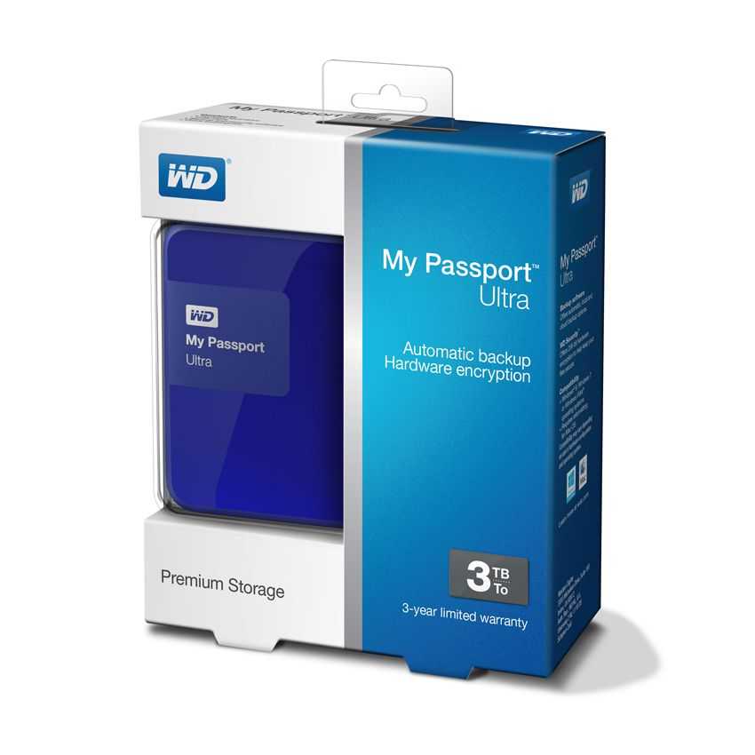 Descripción Western Digital My Passport Ultra 3TB. Capacidad de disco duro: 3000 GB, Interfaz del disco duro: USB 3.0, Tipo de dispositivo: Unidad de disco duro. Tecnología de conectividad: Alámbrico, Versión USB: 3.0, Velocidad de transferencia de datos: 5000 Mbit/s. Algoritmos de seguridad soportados: 256-bit AES. Color del producto: Azul. Ancho: 8,157 cm, Profundidad: 11,007 cm, Altura: 2,096 cm