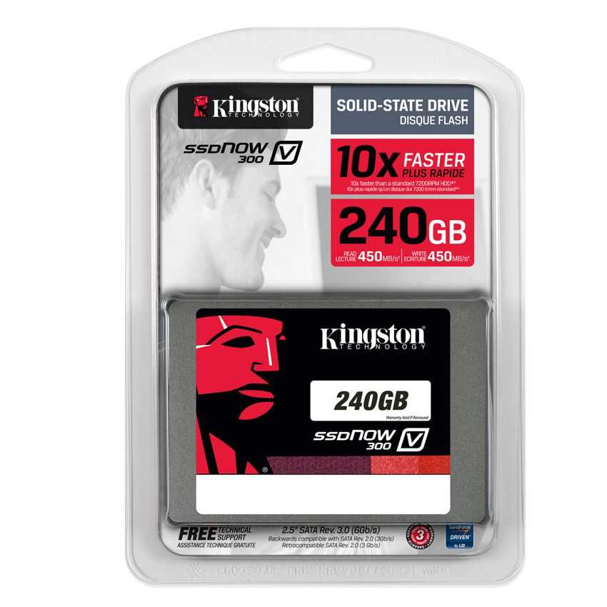 Descripción La unidad de estado sólido SSDNow V300 de Kingston le permite revitalizar su ordenador de forma económica a la vez que mejora su rendimiento y su capacidad de respuesta. Es 10 veces más rápida que un disco duro de 7200 RPM, además de ser más fiable, resistente y a prueba de impactos, y no tiene piezas móviles. Cuenta con un controlador LSI® SandForce® personalizado para Kingston y componentes de la mejor calidad que son asequibles para los que compran por primera vez una SSD. SSDNow V300 está disponible en kits provistos de todos los accesorios necesarios para agilizar la transición a los últimos avances tecnológicos, a un coste inferior al de un sistema nuevo. Para mayor tranquilidad, la memoria está respaldada por tres años de garantía, soporte técnico gratuito y la legendaria fiabilidad de Kingston®.