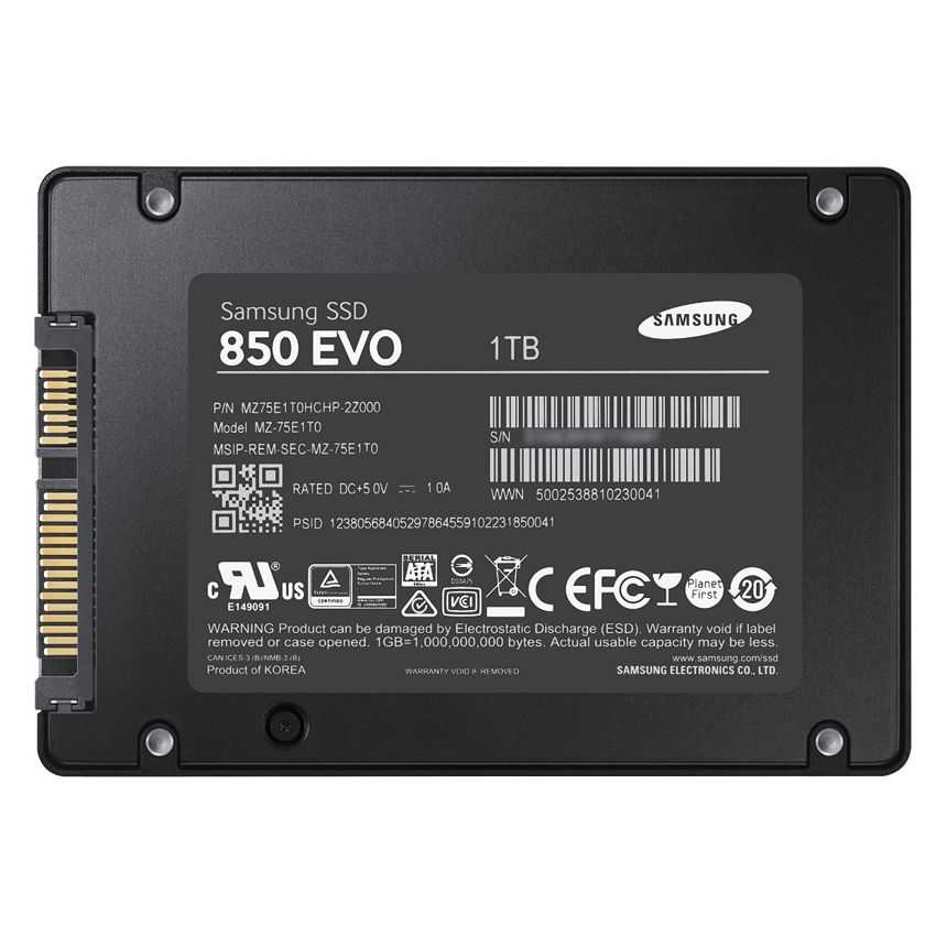 Descripción Samsung 1TB 850 EVO. Disco de estado sólido, capacidad: 1000 GB, Interfaces de disco de estado sólido: Serial ATA III, Velocidad de lectura: 540 MB/s. Tamaño: 6,35 cm (2.5"), Color del producto: Negro. Consumo de energía (lectura): 0,1W, Consumo de energía (escritura): 0,1W, Consumo de energía (espera): 0,045W. Ancho: 6,985 cm, Profundidad: 10 cm, Altura: 6,8 mm (0.268")