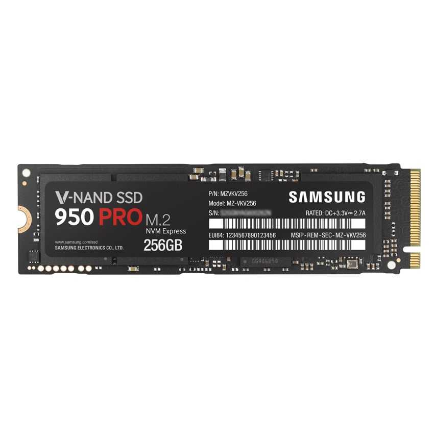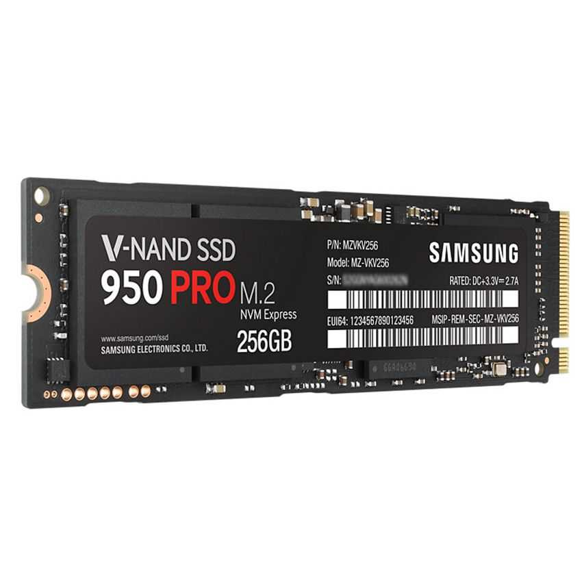 Descripción Samsung 950 PRO. Disco de estado sólido, capacidad: 256 GB, Interfaces de disco de estado sólido: M.2, Velocidad de lectura: 2200 MB/s. Color del producto: Negro. Consumo energético (en suspensión): 0,0025 W, Consumo de energía (lectura): 5,1 W, Consumo de energía (escritura): 5,1 W. Ancho: 8,02 cm, Profundidad: 2,21 cm, Altura: 2,38 mm