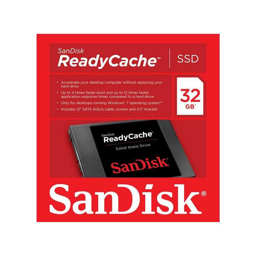 Descripción Sandisk ReadyCache 32GB. Disco de estado sólido, capacidad: 32 GB, Interfaces de disco de estado sólido: Serial ATA III, Velocidad de transferencia de datos: 6 Gbit/s. Color del producto: Negro. Consumo de energía (lectura): 0,5W, Consumo de energía (escritura): 0,5W. Ancho: 6,985 cm, Profundidad: 10,05 cm, Altura: 9,5 mm (0.374"). Software incluido: ExpressCache
