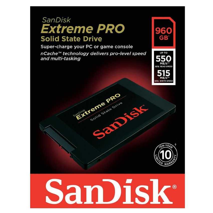Descripción Sandisk 960GB Extreme PRO. Disco de estado sólido, capacidad: 960 GB, Interfaces de disco de estado sólido: Serial ATA III, Velocidad de lectura: 550 MB/s. Color del producto: Negro. Consumo de energía (lectura): 0.15W, Consumo de energía (escritura): 0.15W. Ancho: 6.985 cm, Profundidad: 10.05 cm, Altura: 7 mm
