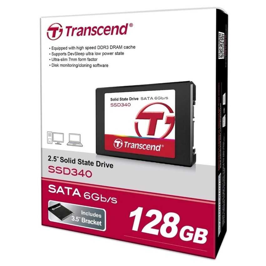 Descripción Transcend 128GB SATA III 6Gb/s SSD340 (Premium). Disco de estado sólido, capacidad: 128 GB, Interfaces de disco de estado sólido: Serial ATA III, Velocidad de lectura: 520 MB/s. Tamaño: 63.5 mm (2.5 "), Funciones de protección: Resistente a golpes, Certificación: CE, FCC, BSMI. Voltaje de operación: 5 V. Ancho: 99.8 mm, Profundidad: 69.8 mm, Altura: 7 mm