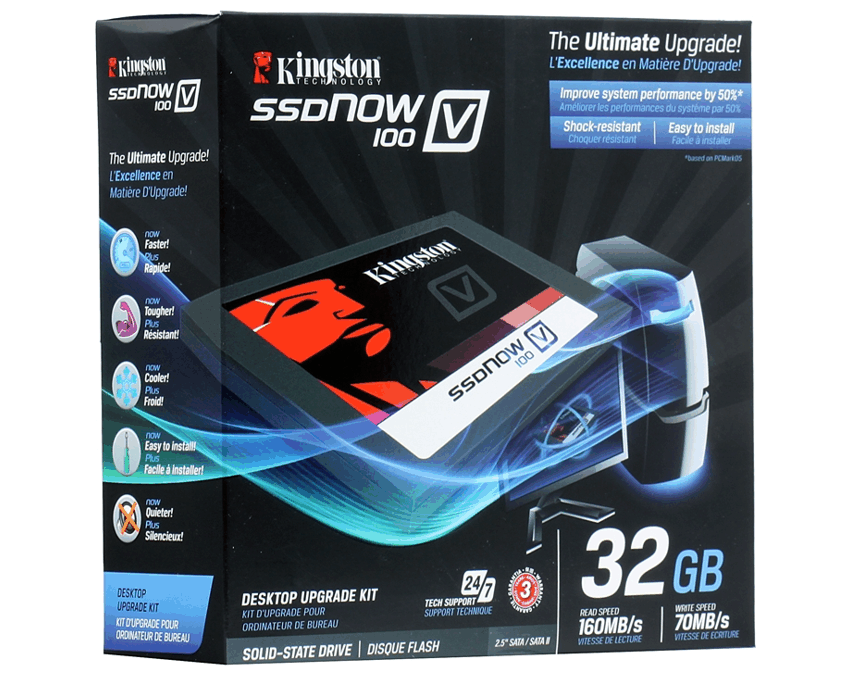 Kingston SSD 32GB Desktop Bundel SSDNow V100 Series SATA2 2.5" SV100S2D/32G Las unidades de estado sólido SSDNow V100 de Kingston Technology son mucho más rápidas y tienen un rendimiento impresionante. Como aceleran el arranque y la carga de aplicaciones, los usuarios son más productivos. Y, además, evitan los fallos propios de los discos duros y otros errores comunes. Las unidades SSDNow V100 son perfectas para los usuarios particulares y las empresas pequeñas que buscan una solución asequible para prolongar la vida de los ordenadores de sobremesa y los portátiles sin tener que sustituir el sistema completo. Están especialmente pensadas para usuarios que trabajan desde casa, por ejemplo, diseñadores, fotógrafos, editores de vídeo, investigadores, administradores y formadores autónomos, así como cualquier profesional que tenga que desplazarse por trabajo. La ausencia de piezas móviles proporciona fiabilidad y resistencia para uso profesional tanto en la oficina como en los desplazamientos. La transición a las soluciones SSD se realiza por medio de kits de actualización diseñados para los sistemas de ordenadores de sobremesa o portátiles. En los kits V100 se incluye todo lo necesario para instalar las unidades SSD, por ejemplo, los cables, las abrazaderas (sólo para ordenadores de sobremesa) y el software para copiar en cuestión de minutos los archivos más importantes del usuario: documentos, películas, música, juegos y el sistema operativo. El kit para portátiles se suministra con una caja que permite utilizar el disco duro del sistema como dispositivo de almacenamiento extra por medio de un puerto USB. Las unidades SSDNow cuentan con tres años de garantía, asistencia técnica ininterrumpida y la fiabilidad que caracteriza a todos los productos de Kingston® Technology.