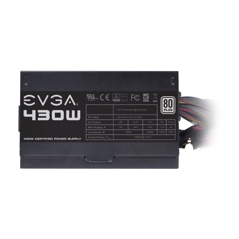 Descripción EVGA 430W. Potencia total: 430 W, Voltaje de entrada AC: 100 - 240 V, Frecuencia de entrada AC: 50 - 60 Hz. Alimentador de energía para tarjeta madre: 24-pin ATX, Tipo de cableado: No modular. Certificación 80 PLUS: 80 PLUS, Tecnología de rodamientos: Funda, Tiempo medio entre fallos: 100000 h. Color del producto: Negro, Diámetro de ventilador: 12 cm, Número de ventiladores: 1 Ventilador(es). Ancho: 150 mm, Profundidad: 140 mm, Altura: 85 mm