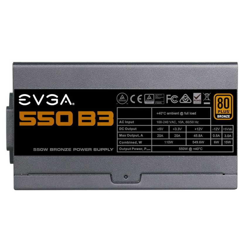 Descripción EVGA 550 B3. Potencia total: 550 W, Voltaje de entrada AC: 100 - 240, Frecuencia de entrada AC: 50 - 60. Diámetro de ventilador: 13 cm, Número de ventiladores: 1 Ventilador(es), Ubicación de ventilador: Superior. Alimentador de energía para tarjeta madre: 24-pin ATX, Longitud del cable de alimentación de la placa base: 60 cm, Longitud del cable de alimentación SATA: 700,500,600 mm. Utilizar con: PC, Power supply unit (PSU) form factor: ATX, Nivel de ruido: 35 dB. Color del producto: Gris